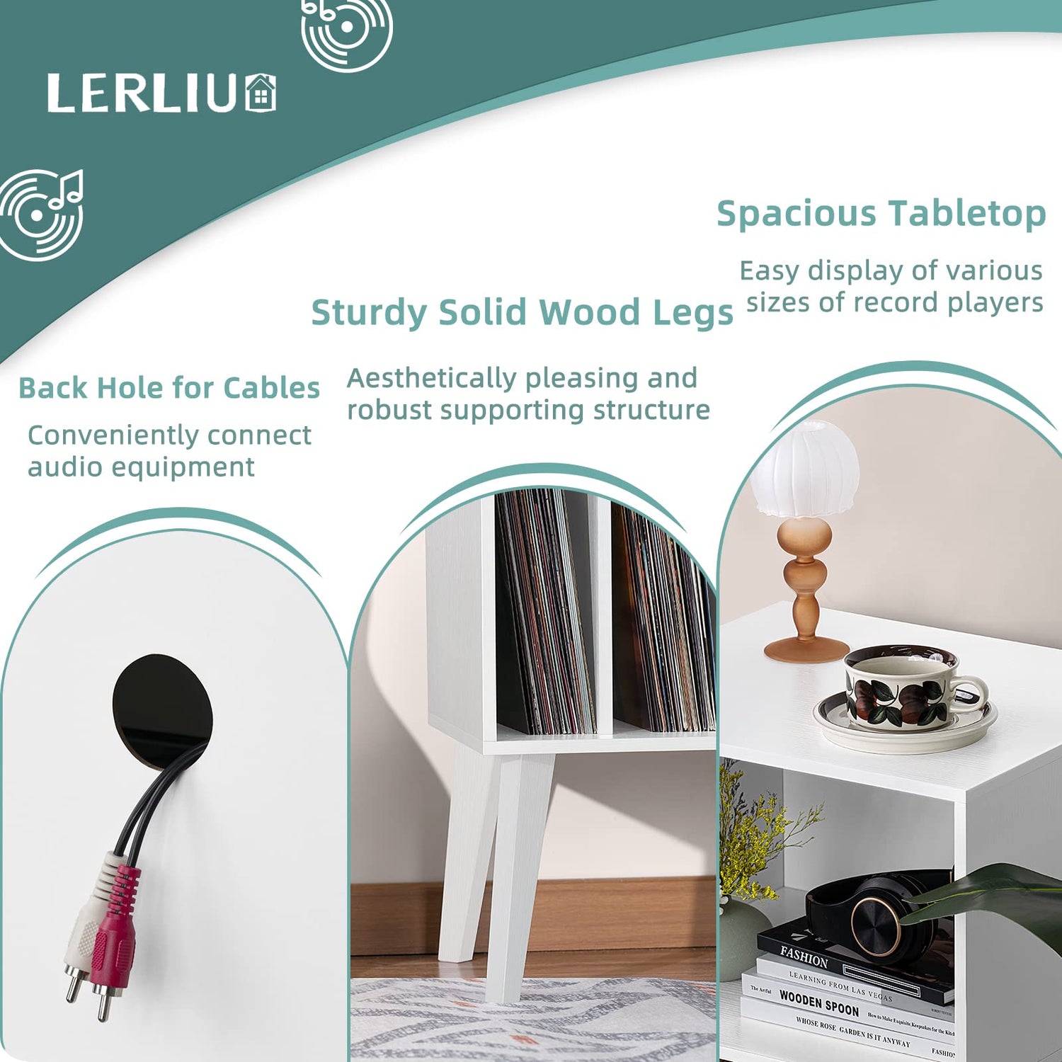 Lerliuo Record Player Stand with Charging Station, White Turntable Stand Holds up to 160 Albums, Mid-Century Vinyl Storage Cabinet Table with Wood Legs, Record Holder Dispaly Shelf for Living Room