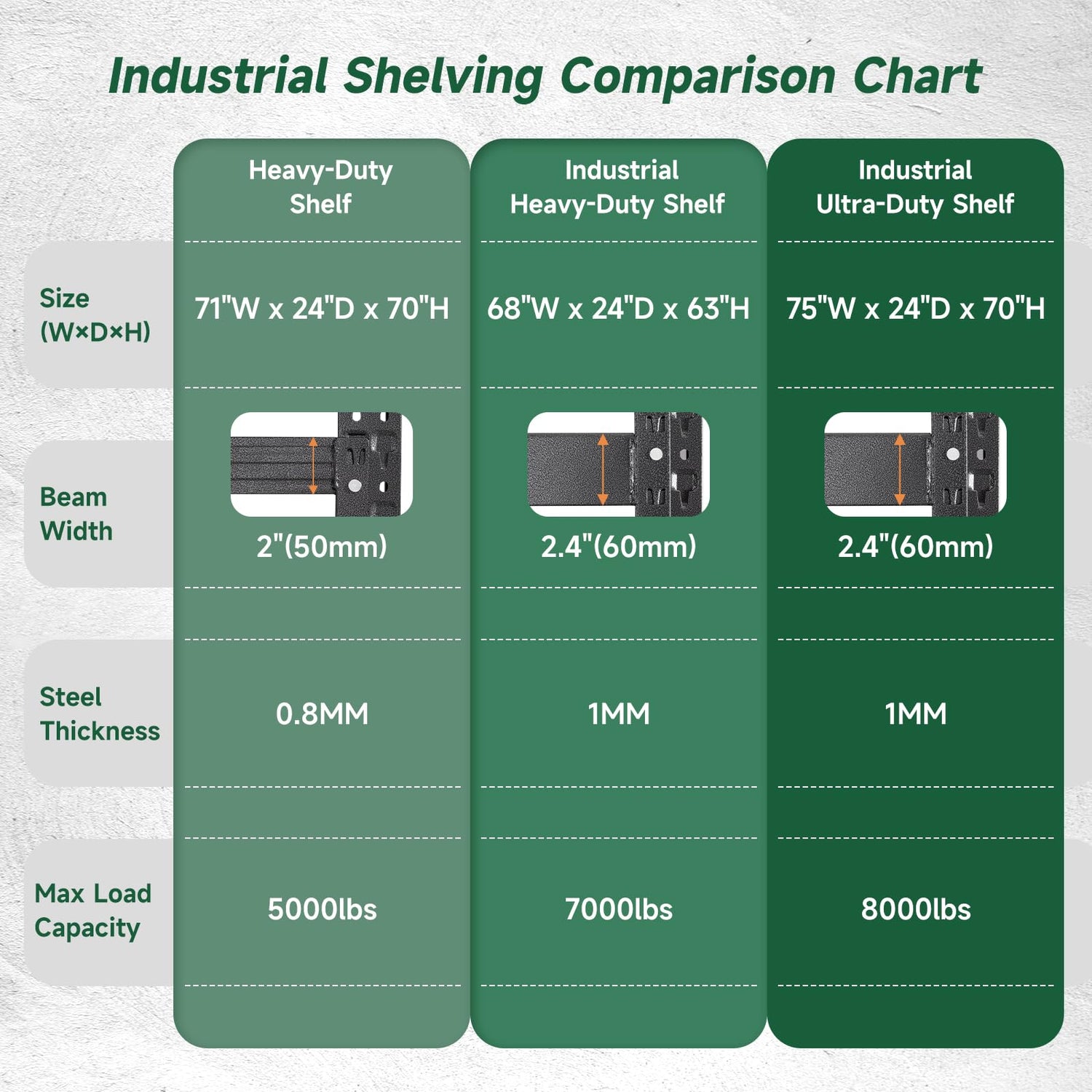 - HEAVY DUTY ALL METAL GARAGE SHELVING:Built with seamless, one-piece columns free of joints or connections, our super heavy-duty garage shelving eliminates weak points for maximum stability under extreme loads. Featuring wider and thicker columns than standard models, it supports up to 5,000 lbs with a solid foundation. Unlike conventional shelving that uses segmented posts and buckles—which complicate assembly and weaken strength—our monolithic design simplifies setup while dramatically increasing load capacity and safety