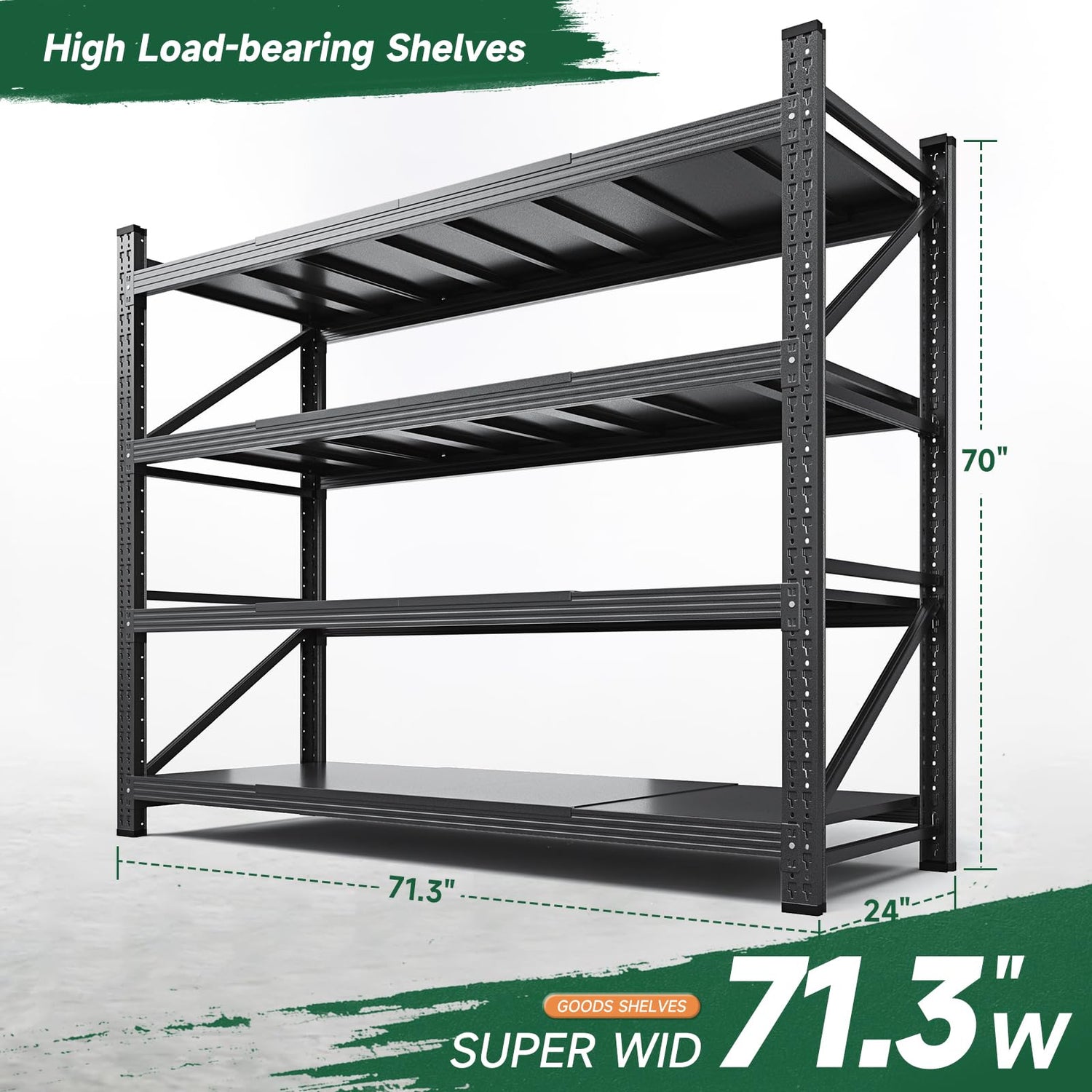 - 71.3" W x 24" D x 70" H GARAGE STORAGE SHELVING UNITS:The extra-wide utility shelf measures 71" W x 24" D x 70" H, making it an ideal storage solution for a wide range of settings—from garages, basements, and workshops to pantries, kitchens, and supermarkets. Its spacious design accommodates large and bulky items of various sizes, helping maximize storage capacity while supporting an organized and clutter-free environment