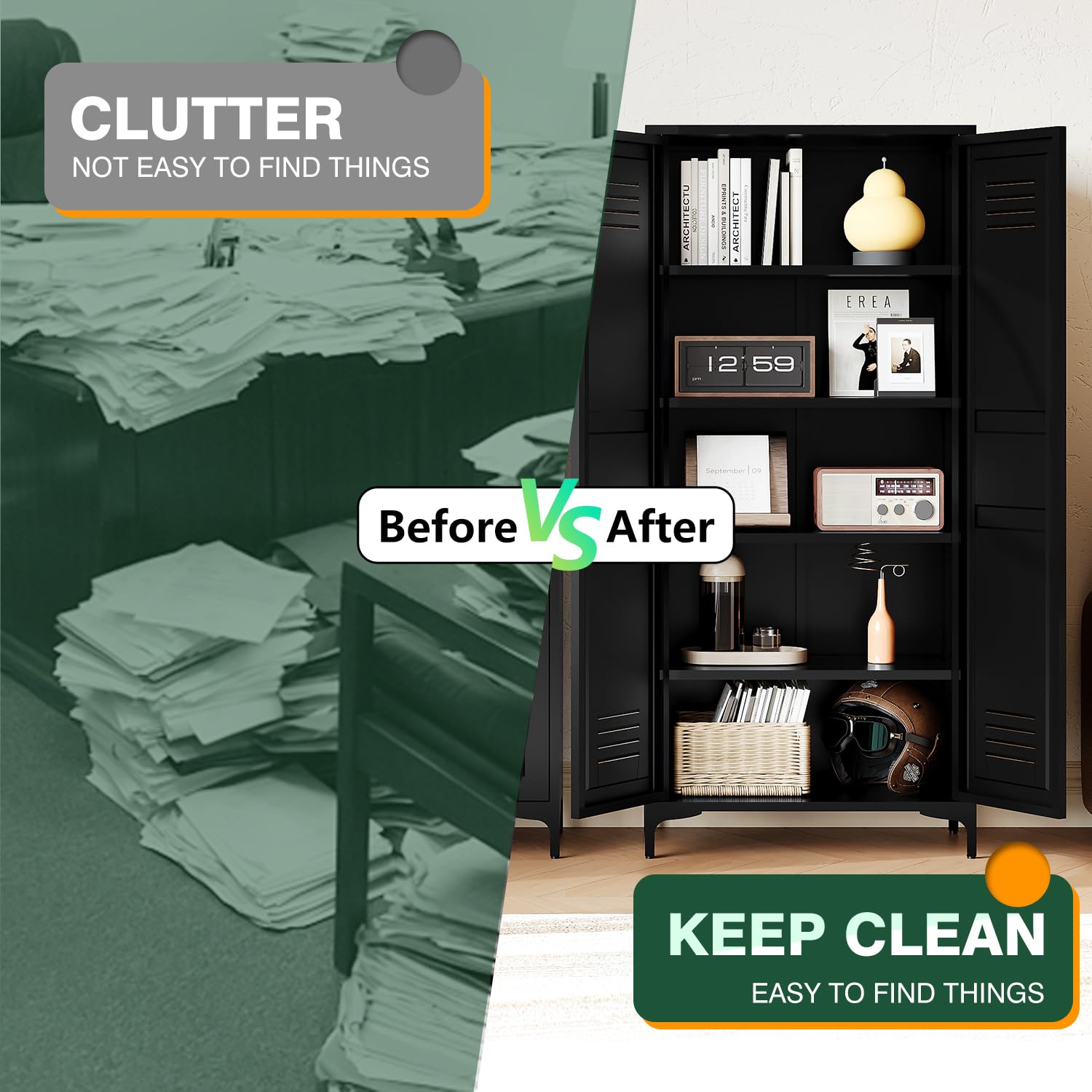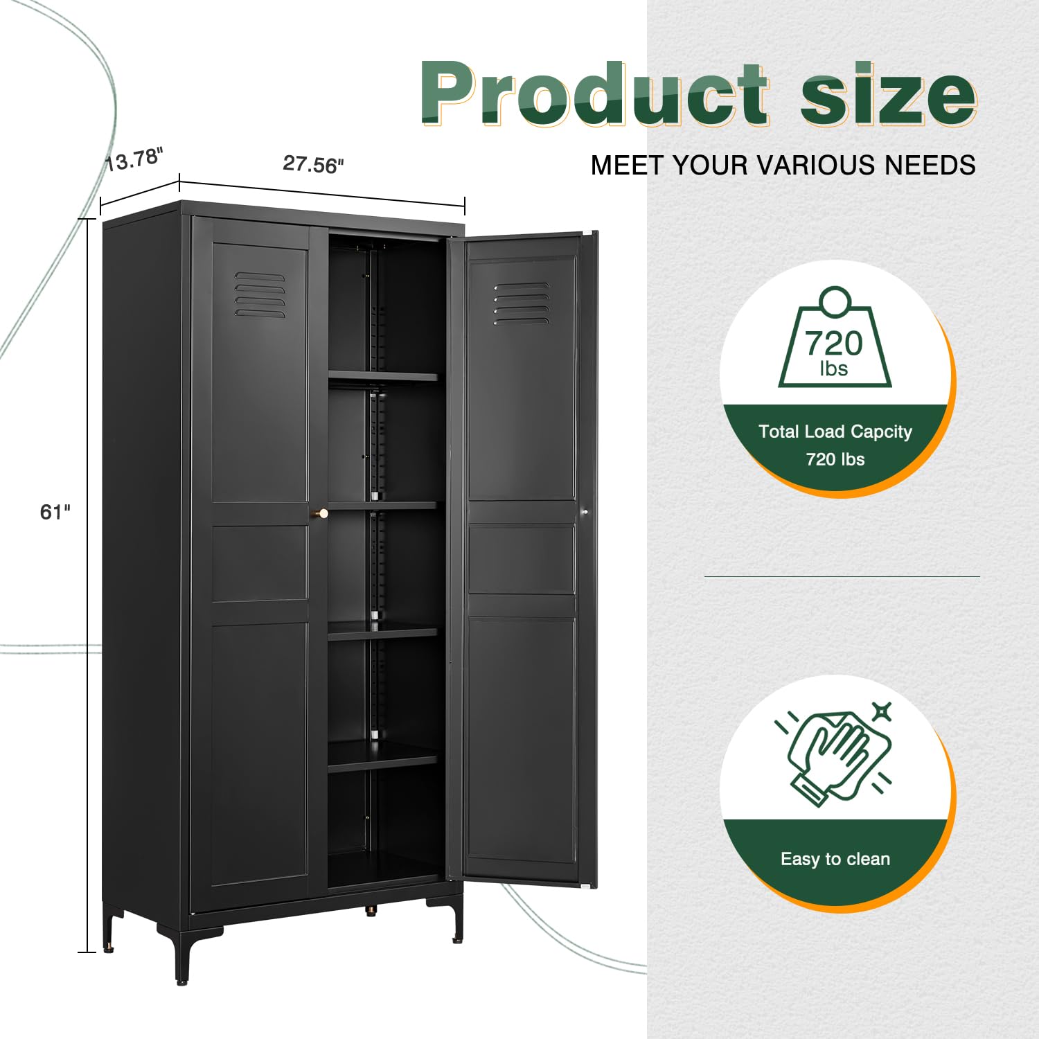 - Practical Design:Each door has 2 magnetic devices to ensure that the door is tightly closed;Two reserved holes on the back panel can be fixed on the wall; Metal cabinet with 4 adjustable shelves,5-floor storage space suitable for a variety of storage applications,improve space utilization by 80% compared to three-layer cabinets