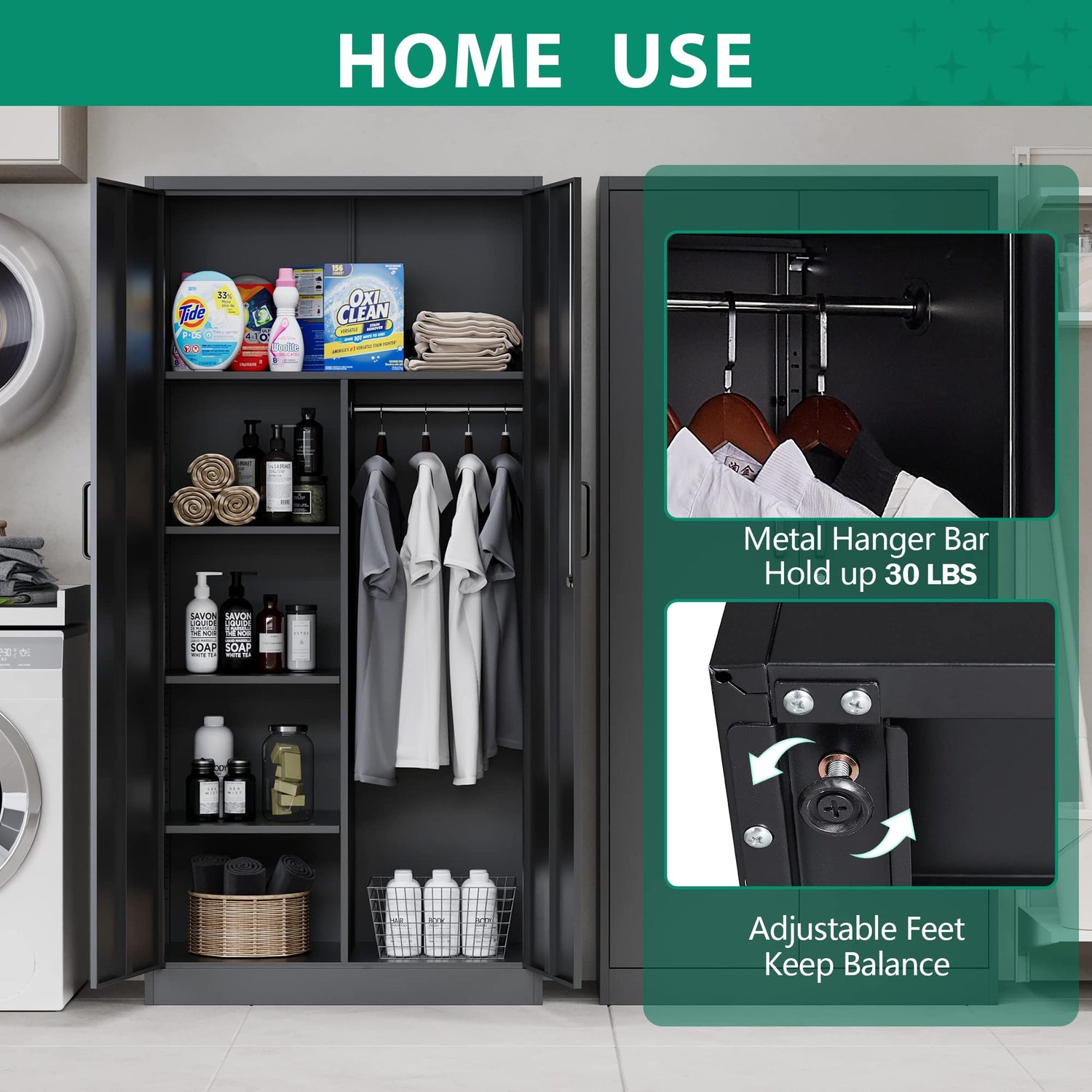 - 【Larger Storage Space】Storage Cabinet Size: 72"H x 36"W x 18"D. Metal Storage Cabinet with adjustable Shelves and Hanging Rod,hang your clothes and DIY locker.