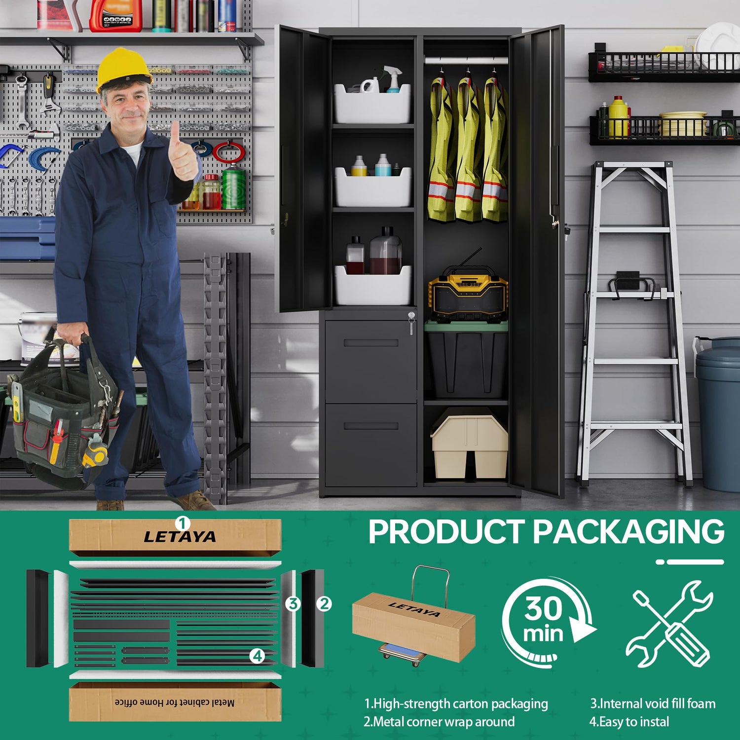 - 『Multifunctional Metal Cabinet』Metal cabinet lockable 2 door and 2 Drawers-3 independent lock systems ensure the safety of items;Aluminum alloy clothes rail and adjustable shelves and feet for home office;Drawer can be adjusted with hanging rods for hang A4/F4/letter/legal size documents.