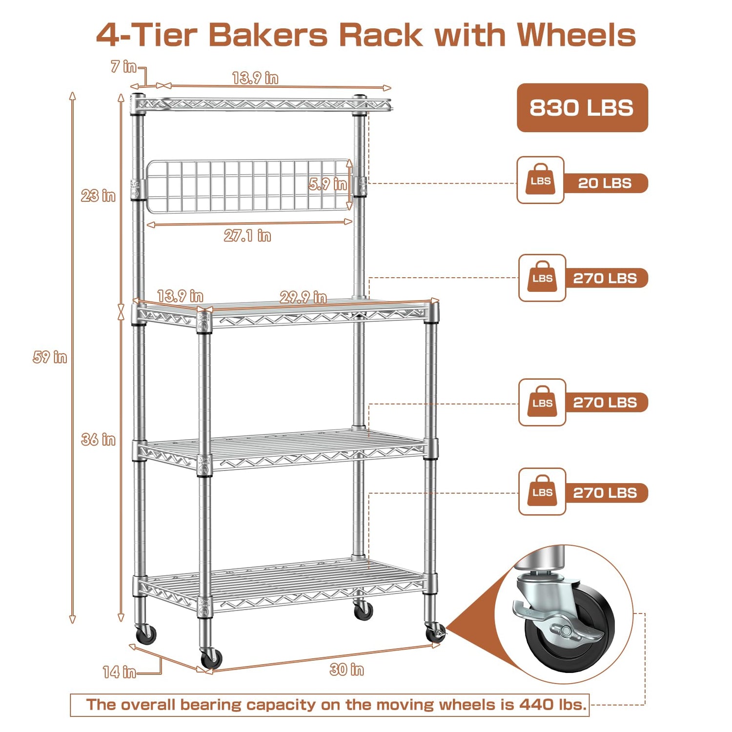 - 【Bakers Rack with Wheels】With the adjustable feet and wheels design, our bakers racks for kitchens with storage can also be switched between usage scenarios at any time, such as kitchens, dining rooms, study rooms, balconies, garages, patios, and more. The metal bakers rack can hold all cooking essentials like coffee pots, microwaves, and spice bottles while taking up only 30 "L x 14 "W x 59 "H of space.