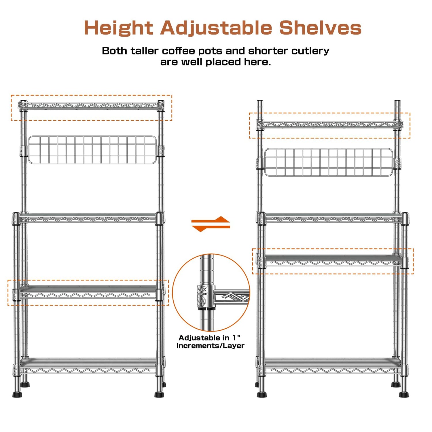 - 【Easy Assembly, No Tools Required】All the accessories and tools for the bakers racks for kitchens are included in the package, and you will receive detailed operating instructions. With clear, illustrated instructions and numbered parts, you can quickly and easily assemble them without any tools. Then you can start cleaning up your cluttered kitchen countertops and getting it organized in no time.