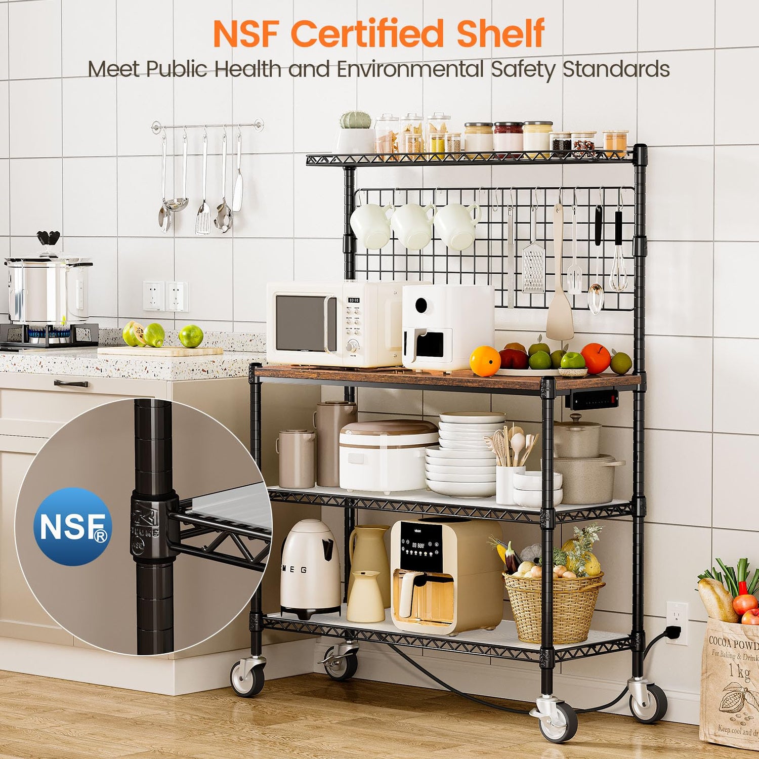 - NSF Certified Kitchen Rack - Leteuke metal bakers rack is certified by NSF/ANSI Standard 2, reliable in quality. As a high-standard commercial-grade kitchen cart, the breathable wire mesh design of each metal shelf makes it perfect for storing fruits and vegetables in a dry environment.