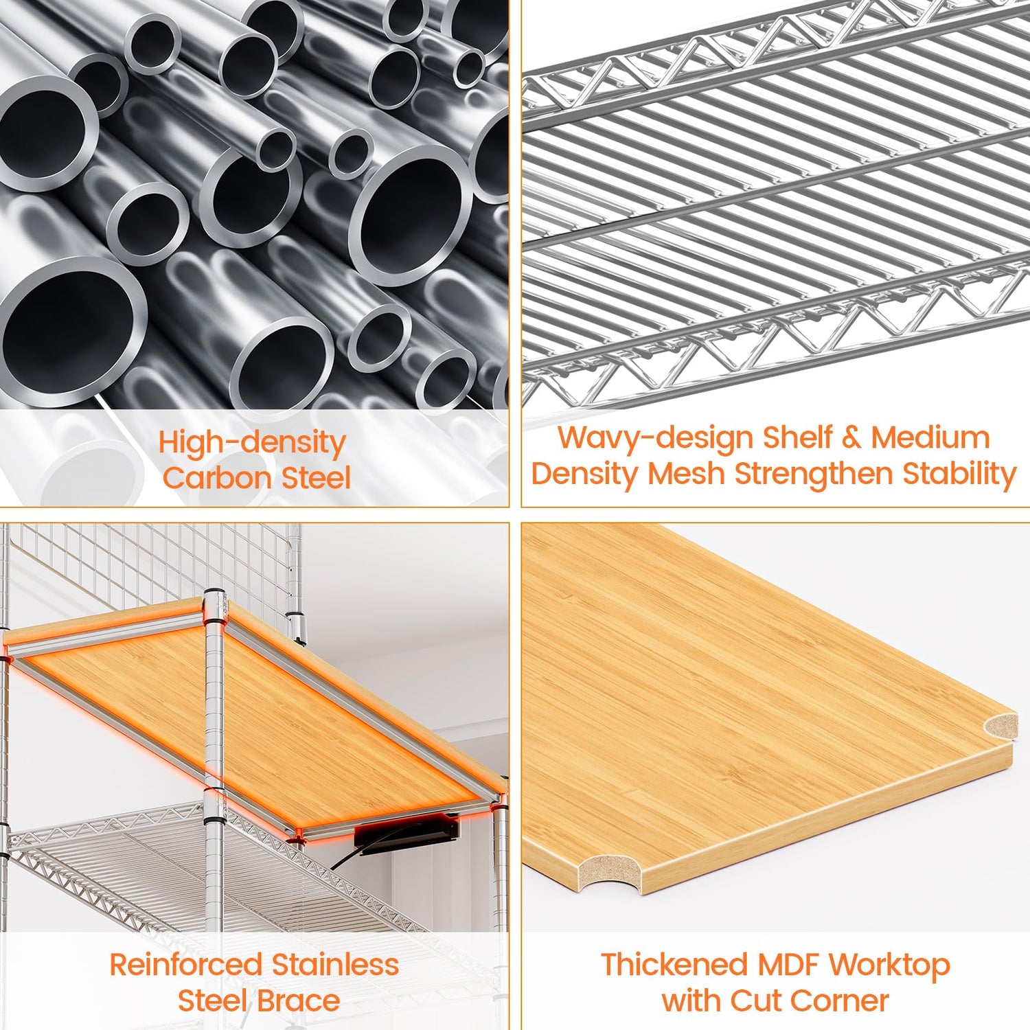 - NSF Certified Kitchen Rack - Leteuke metal bakers rack is certified by NSF/ANSI Standard 2, reliable in quality. As a high-standard commercial-grade kitchen cart, the breathable wire mesh design of each metal shelf makes it perfect for storing fruits and vegetables in a dry environment.