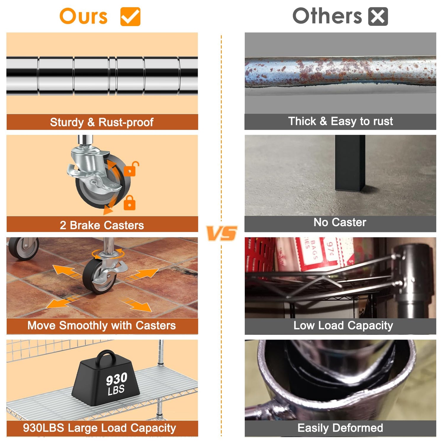 - 【Multifunctional Rolling Storage Rack】Featuring a high-density carbon steel structure with chrome-plated coating, the standing baker racks with wheels are sturdy and rustproof, and can keep a glossy appearance long. With 4 casters (2 with brake) for better mobile storage and 4 adjustable feet for greater stability when used on uneven ground. Weight capacity: When on the leveling feet, it can carry up to 930 lbs. And the overall bearing capacity on the wheels is not less than 450 lbs.