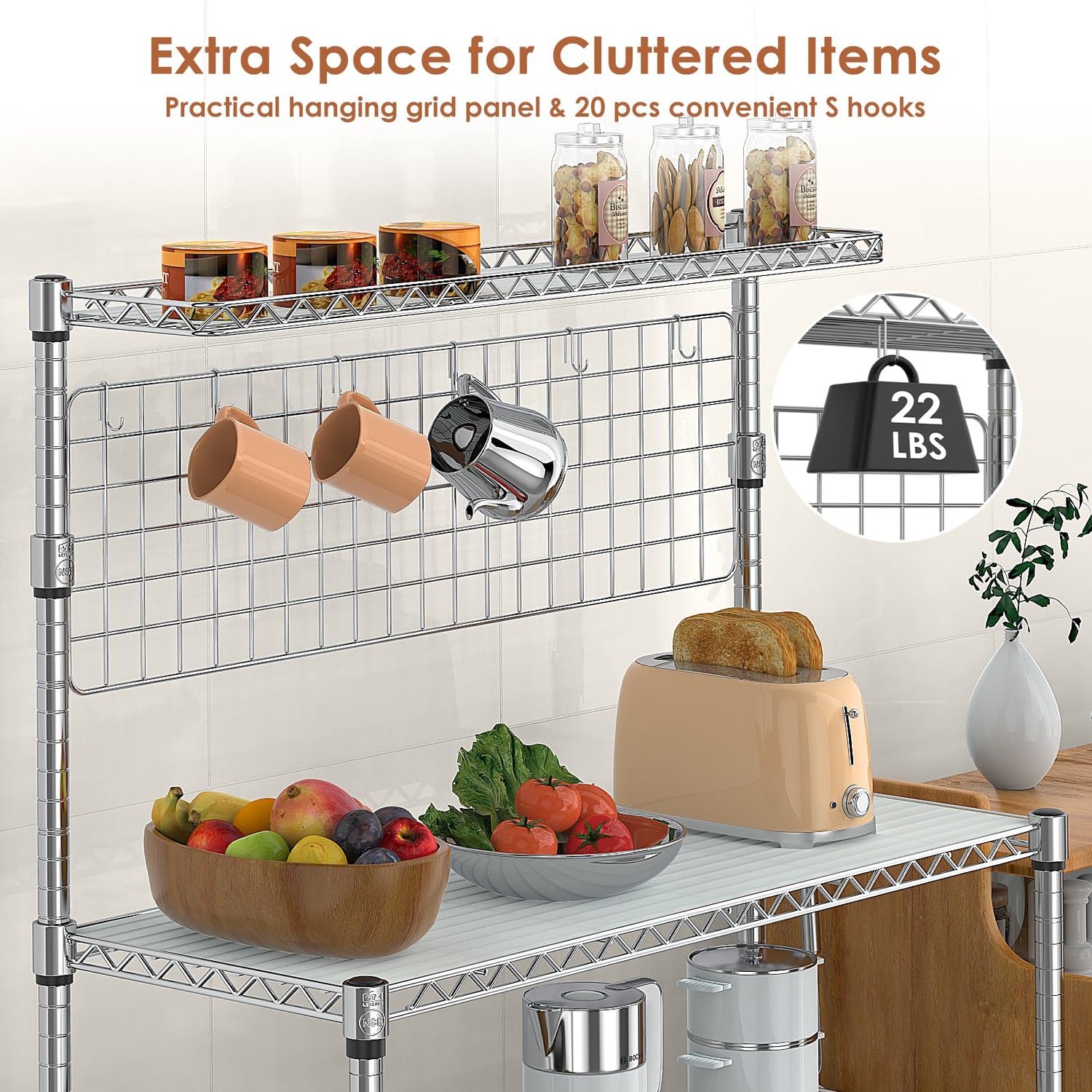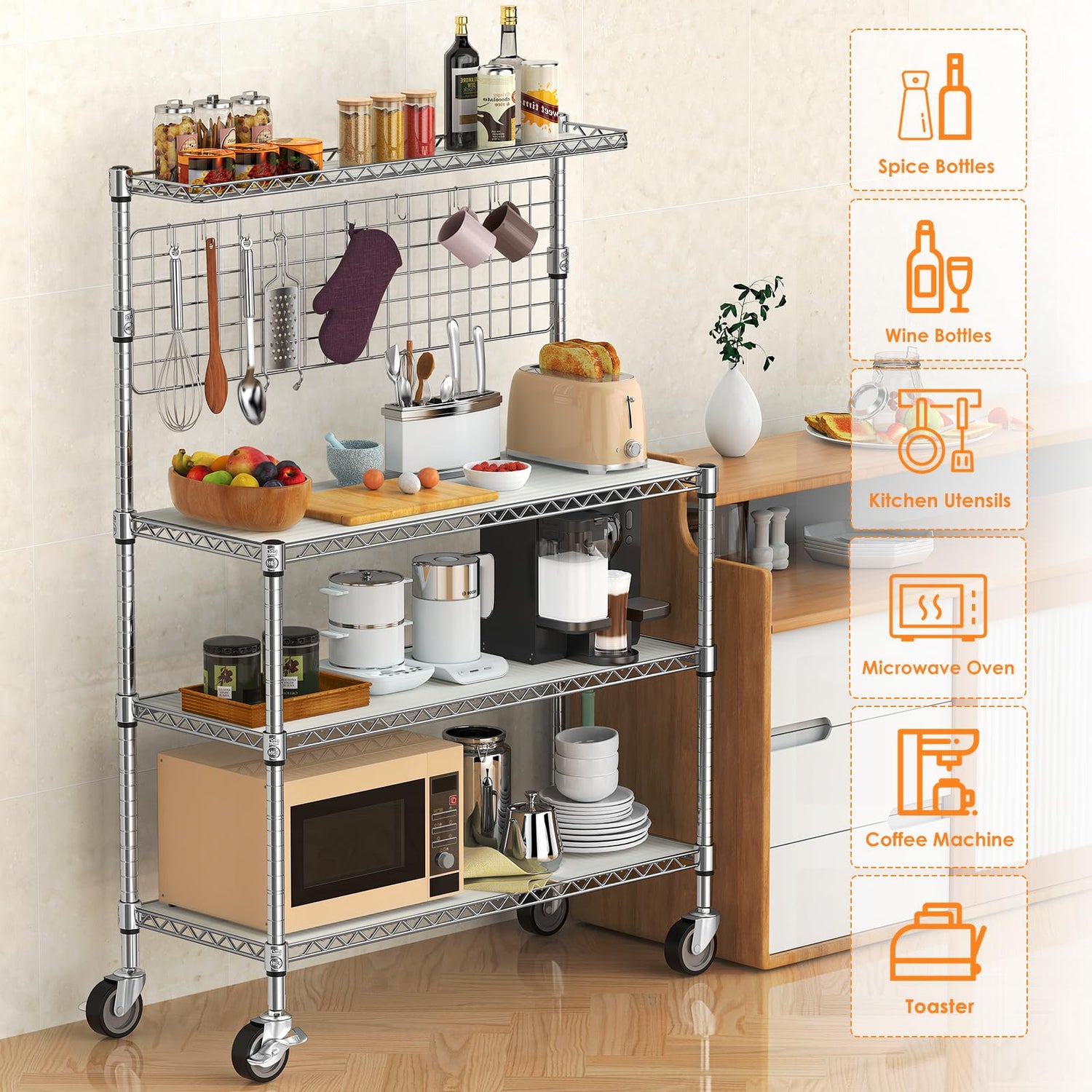 Leteuke Bakers Rack with Storage & Wheels, 42 Inch Microwave Stand Kitchen Shelves, 4-Tier Heavy Duty Storage Rack with 20 S-Hooks, Commercial Metal Utility Kitchen Cart, 42× 18× 63 Inch, Chrome
