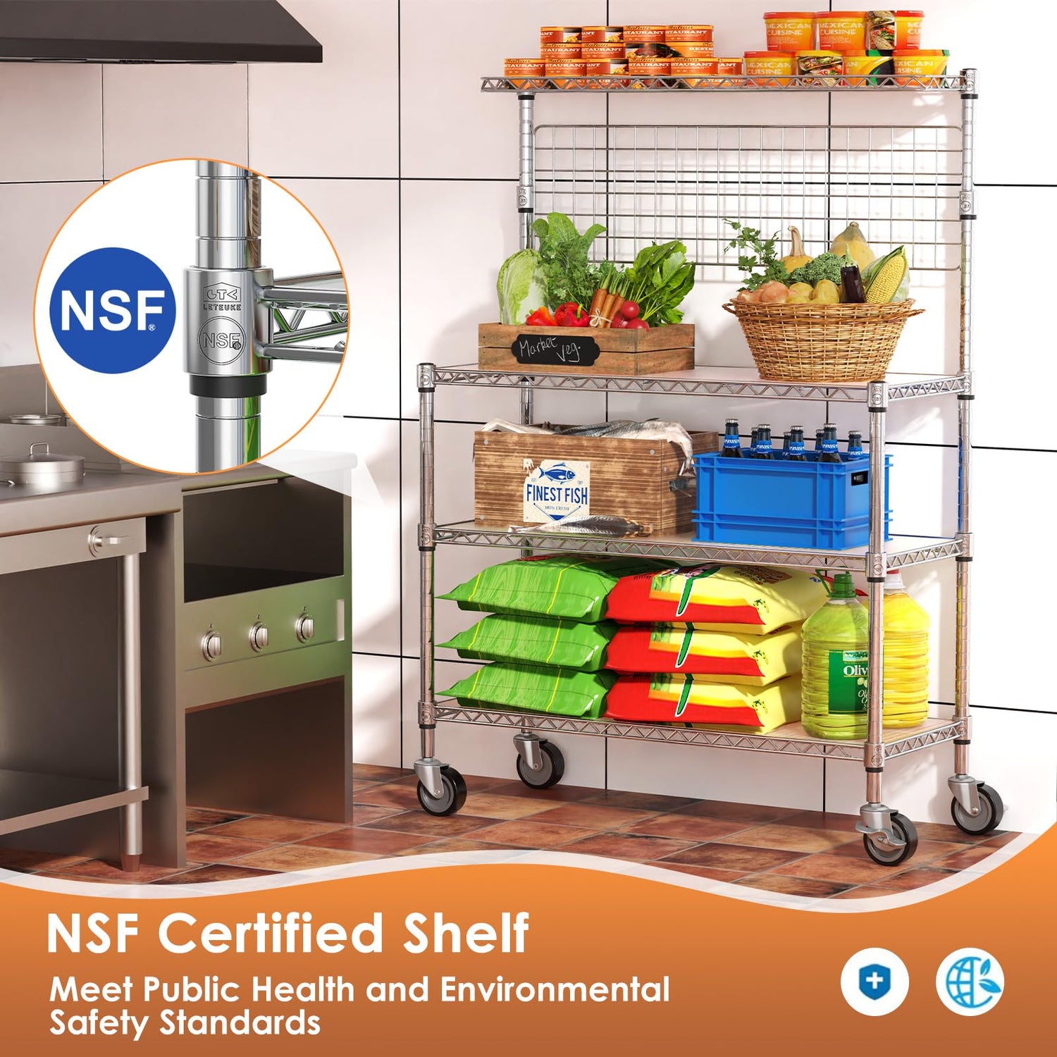 - 【NSF Certified Kitchen Rack】Leteuke metal bakers rack is certified by NSF/ANSI Standard 2, reliable in quality. As a high-standard commercial-grade kitchen storage rack, the breathable wire mesh design of each shelf makes it perfect for storing fruits and vegetables in a dry environment. And it's also safe to store kitchen gadgets, appliances, cookware, snacks and pantry goods, etc.