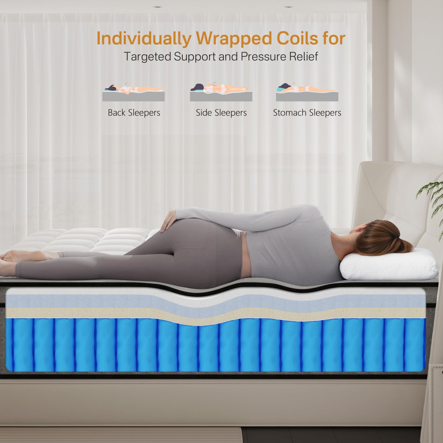 Details: Discover unparalleled comfort with our 12″ medium-firm hybrid mattress—engineered to optimize sleep quality for every position. Featuring a cooling memory foam layer paired with a breathable knit cover, this mattress helps regulate temperature throughout the night (perfect for hot sleepers). Beneath, individually pocketed springs provide responsive support, exceptional motion isolation, and reinforced edge stability. Whether you sleep on your back, side, or stomach, the balanced medium-firm feel adapts to your needs, making it one of the best mattresses for side sleepers and couples alike. With advanced edge support and pressure-relief memory foam, this hybrid mattress delivers both comfort and durability—sleep more soundly, wake more refreshed.