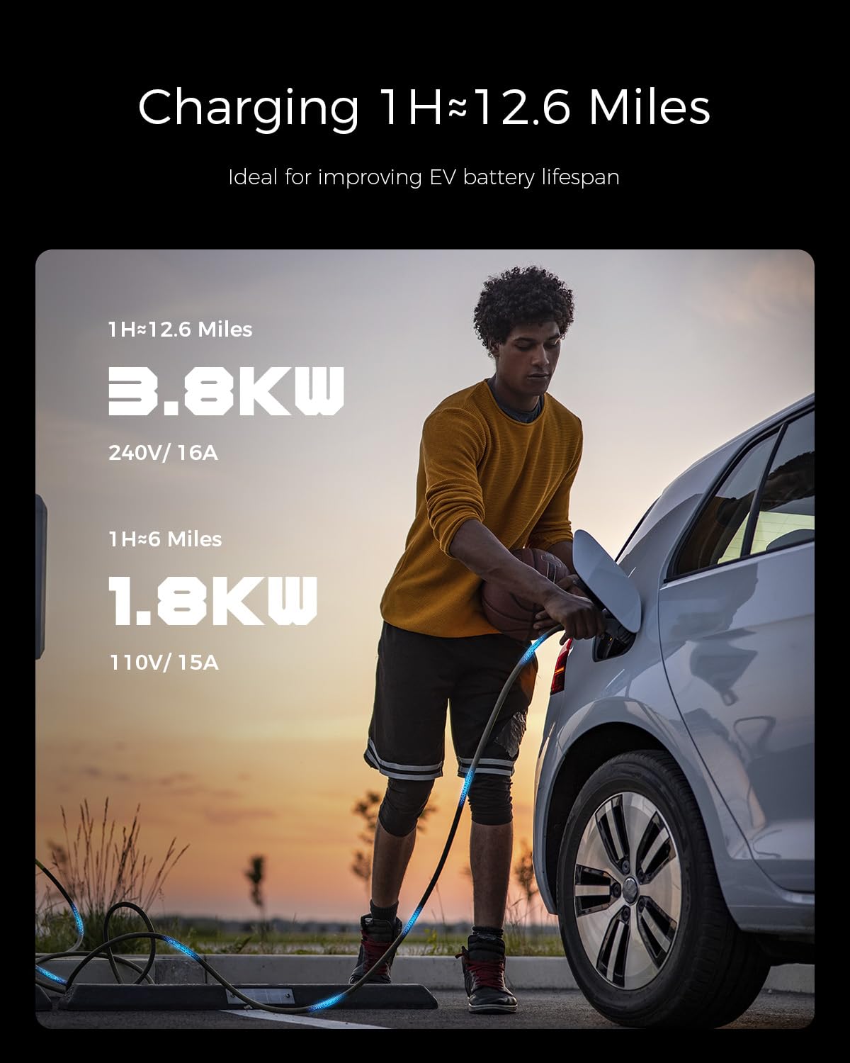 - 【16A Fast Charging】At 240V, the electric car charger EV charger delivers up to 16A and 3.8kW, adding approximately 12 miles of range per hour—about 4 times faster than a standard 8A Level 1 charger, saving you valuable time. For 110V charging (using 5-15R or 5-20R), it provides up to 15A and 1.8kW, adding about 6 miles of range per hour. The Level 1 option is perfect for maintaining your EV battery's health over time.
