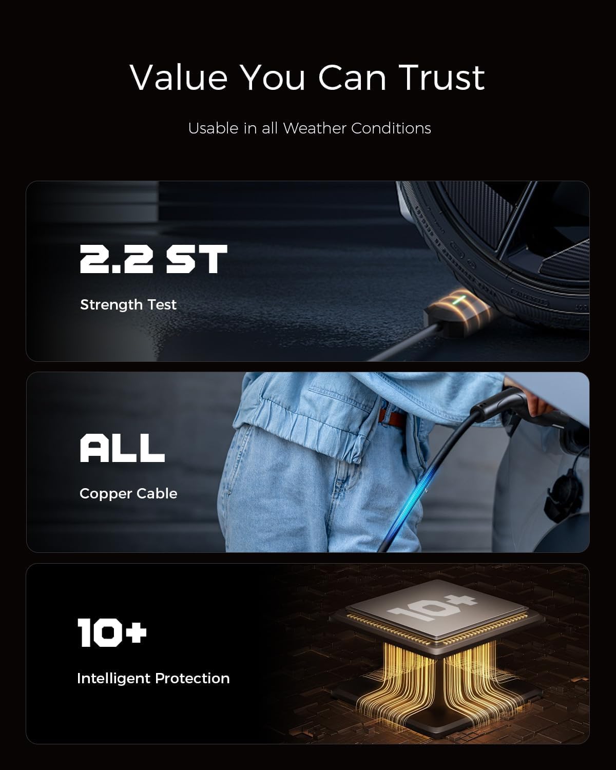 - 【Safety You Can Trust】Our EV charger is incredibly robust, having passed rigorous 2.2 ST pressure testing. Our level 1 charger comes with a full copper cable for optimal conductivity, coupled with a durable TPE flame-retardant jacket for added longevity. It's powered by automotive-grade chips and boasts over 10 smart safety features, including short-circuit and overcurrent protection, ensuring carefree charging for your EV.