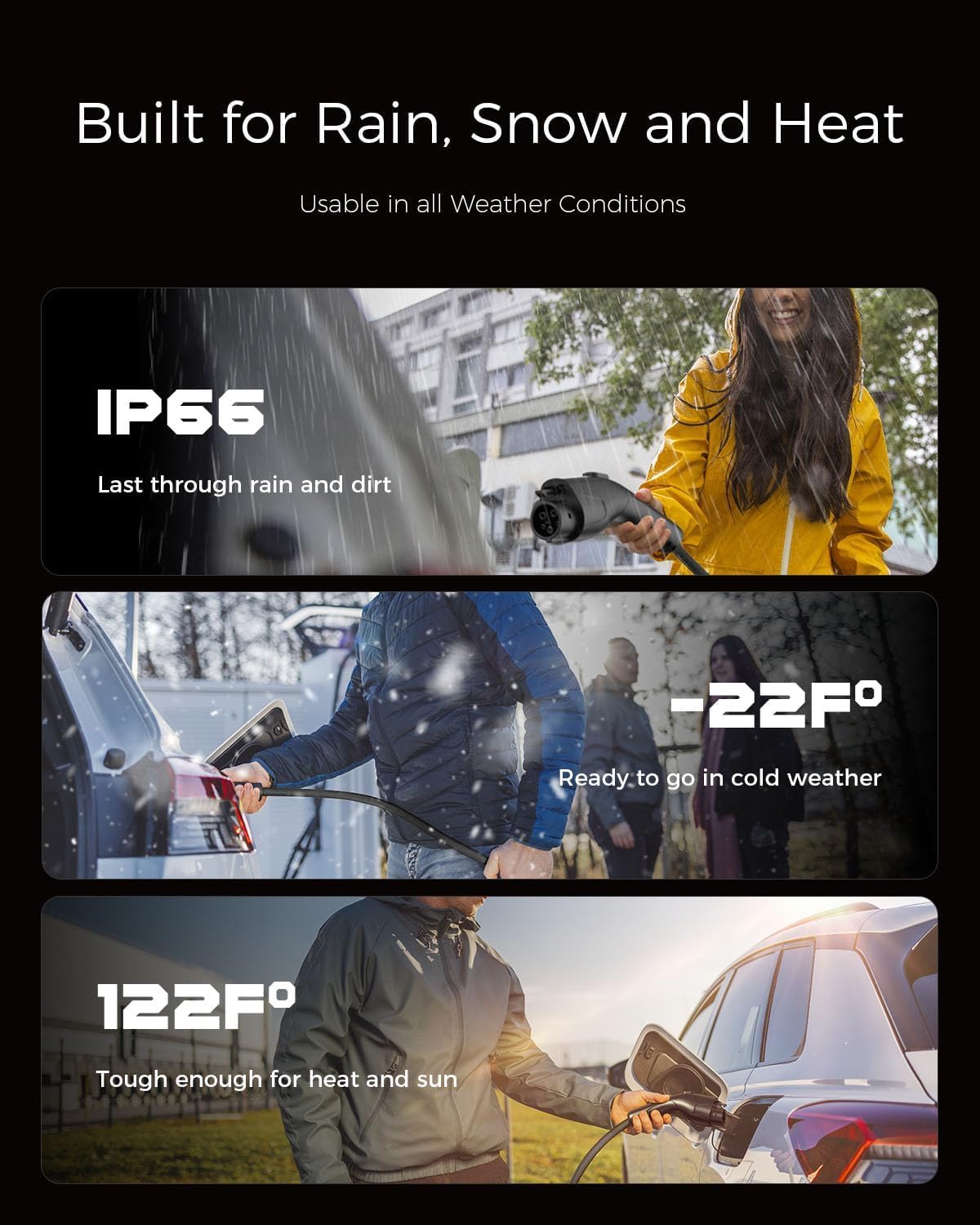 - 【Work with All Weather】The level 1 charger EV charger boasts an IP66 rating for water and dust resistance, making it safe to use even during rainy days. Equipped with a cold-start function, the charger can be plugged in and charged immediately without preheating in low-temperature or severe winter conditions. With a maximum operating temperature of 122°F, the portable ev charger can endure intense summer heat and high temperatures, ensuring normal operation under the blazing sun.