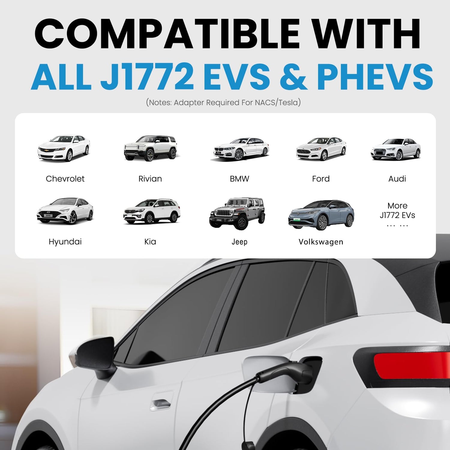 - Universal Compatibility: Equipped with a J1772 plug, this Romaa ev charger compatible with most SAE J1772 charger models, level 1 charger for Jeep, Kia, Hyundai, Ford, Nissan, Chevrolet, Audi, Volkswagen, BMW and more. (Note: Tesla requires an adapter.)