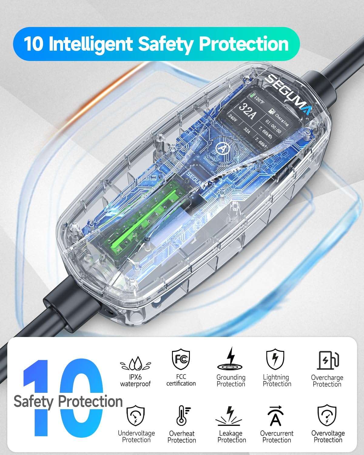 - Wide Compatibility: Seguma 32A level 2 charger is engineered with J1772 connector, works flawlessly with any EV featuring a j1772 charging port. Whether you drive a Ford, Kia, Bolt, this portable ev charger ensures hassle-free charging every time