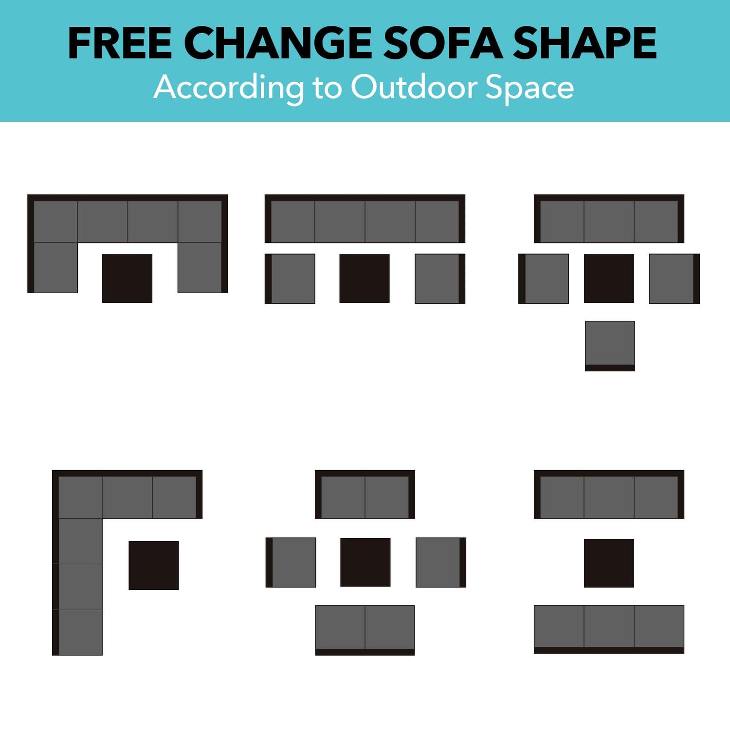 - Flexible Combination:Patio set have many configuration options based on your preference and geography.Clips connect the sectional sofa,fastening strips and velcro tapes prevent cushions from sliding.L shape feet with adjustable screw adapt to variety of different terrains or adjust sofa height.