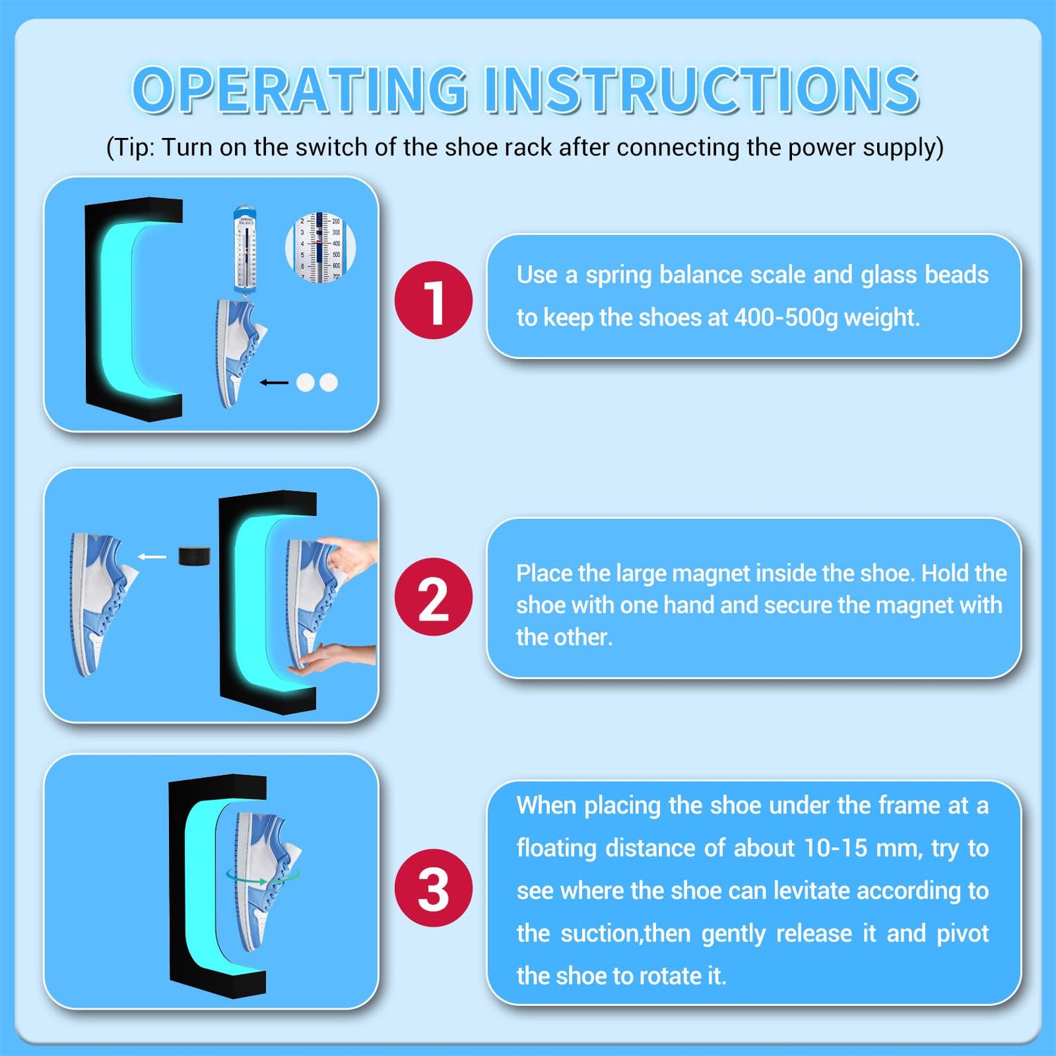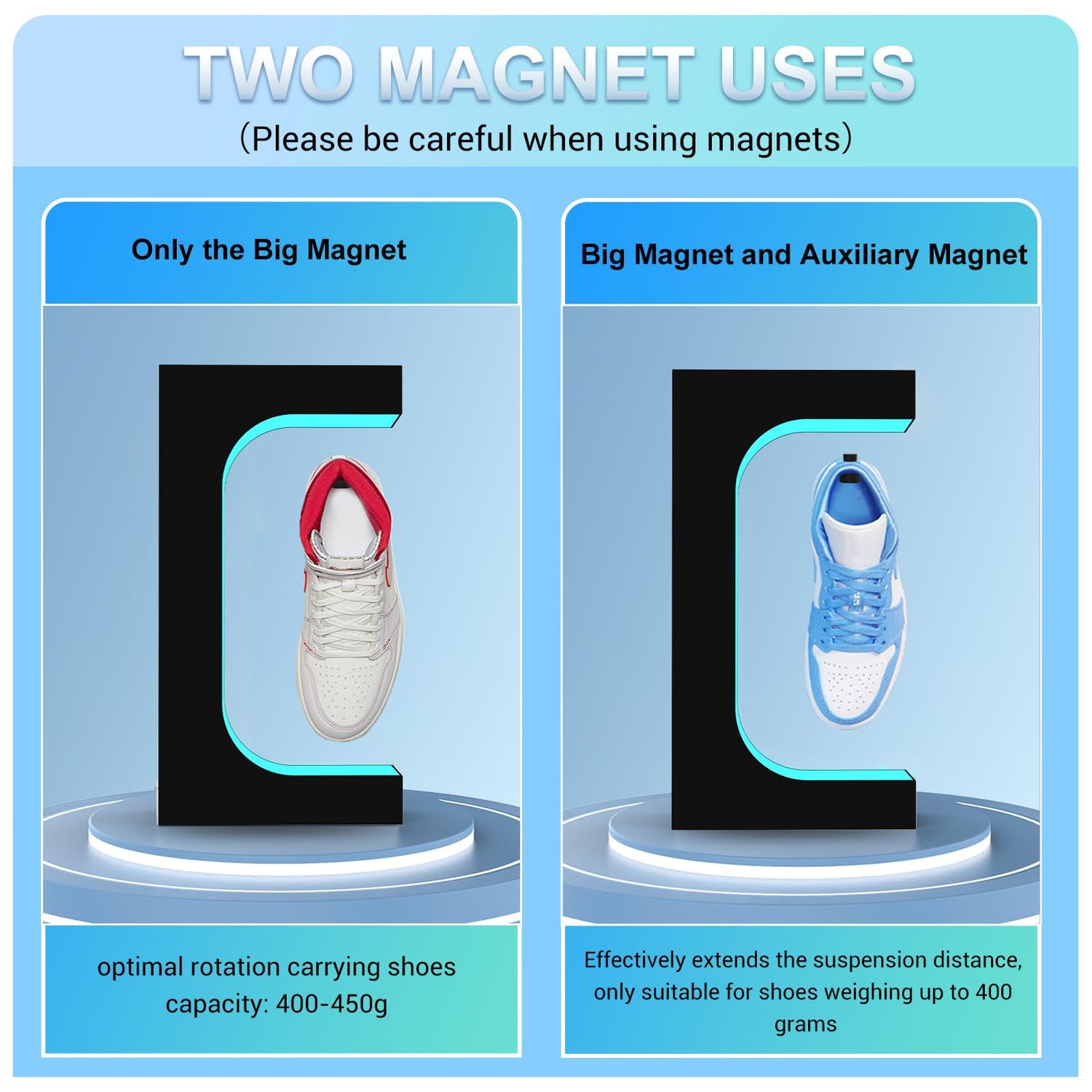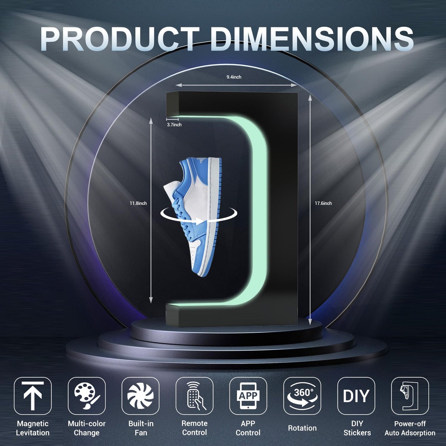 • 【360°Rotation Function】The magnetic shoe display features built-in silent fans and micro-air vents, enabling 360° contactless auto-rotation. Showcase footwear details from every angle through dynamic floating presentation in our shoe levitating display. Warm Tips:For orders of two or more shoes displays: Keep magnets apart to prevent adhesion. Separating large magnets once connected is challenging. This product doesn't include the shoes in the picture.