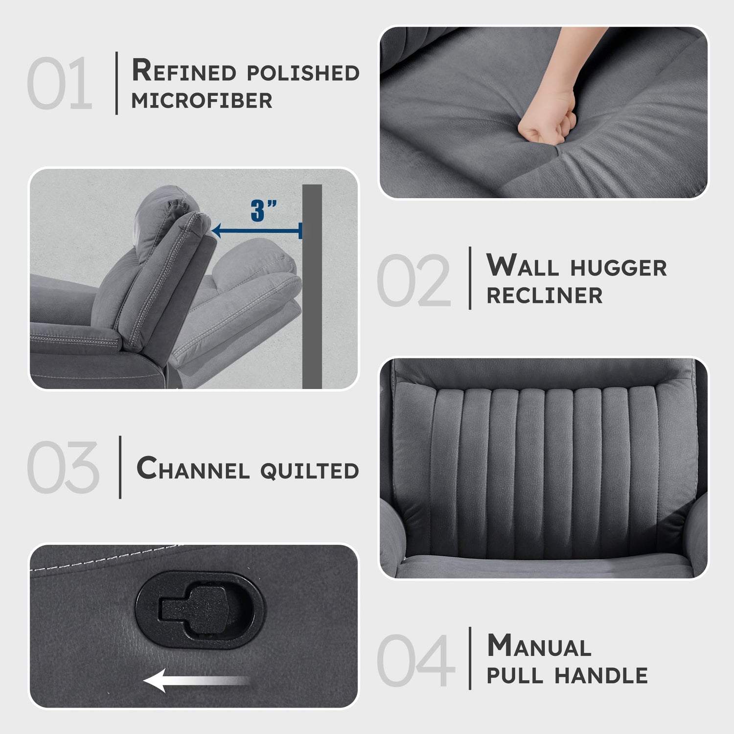- [Deep Cushioned Comfort] This recliner is wrapped in high-quality polished microfiber upholstery, offering a sleek look and exceptional comfort. Designed for relaxation, it features plush padding, an attached backrest, and foam-padded seat cushions with pocket coils for superior support.