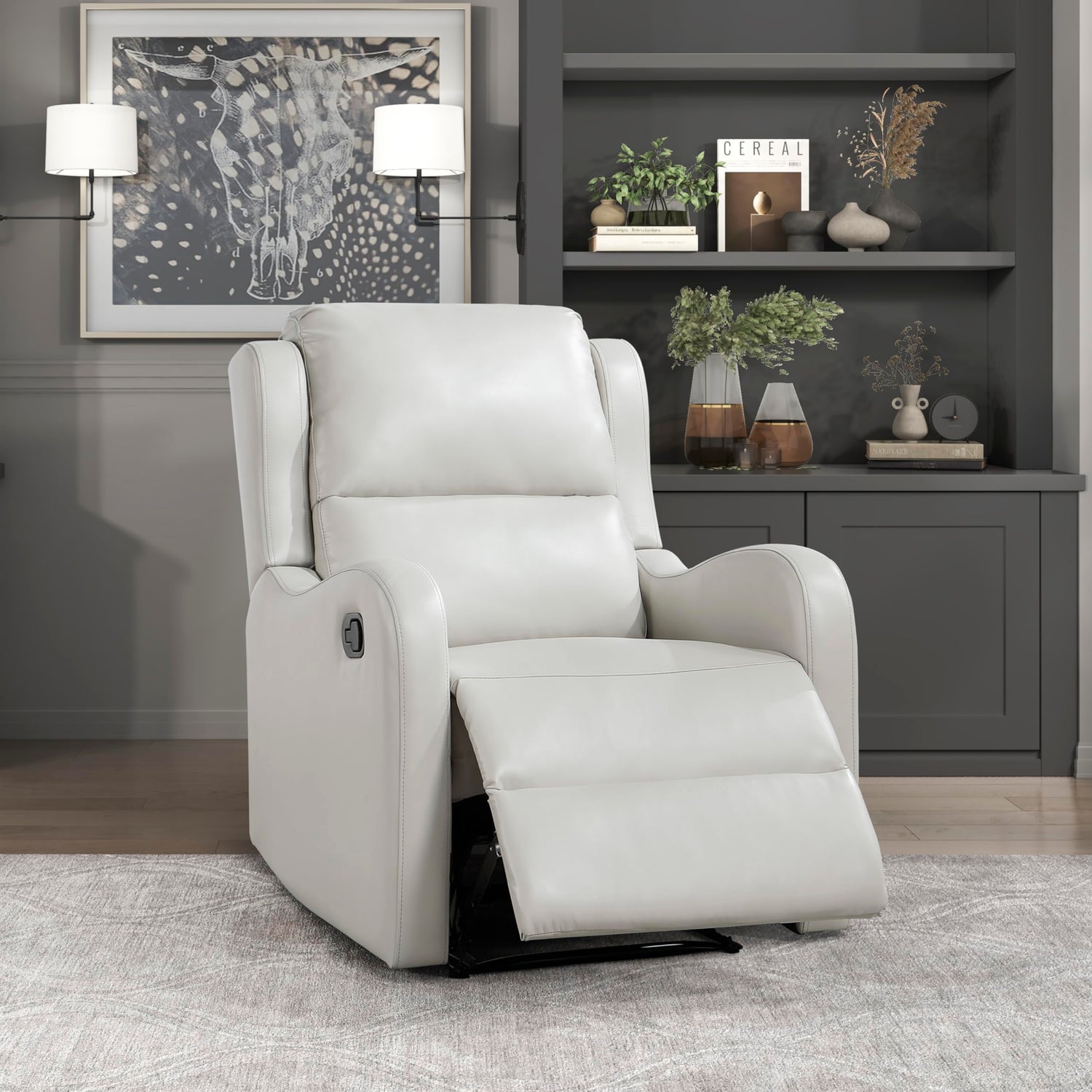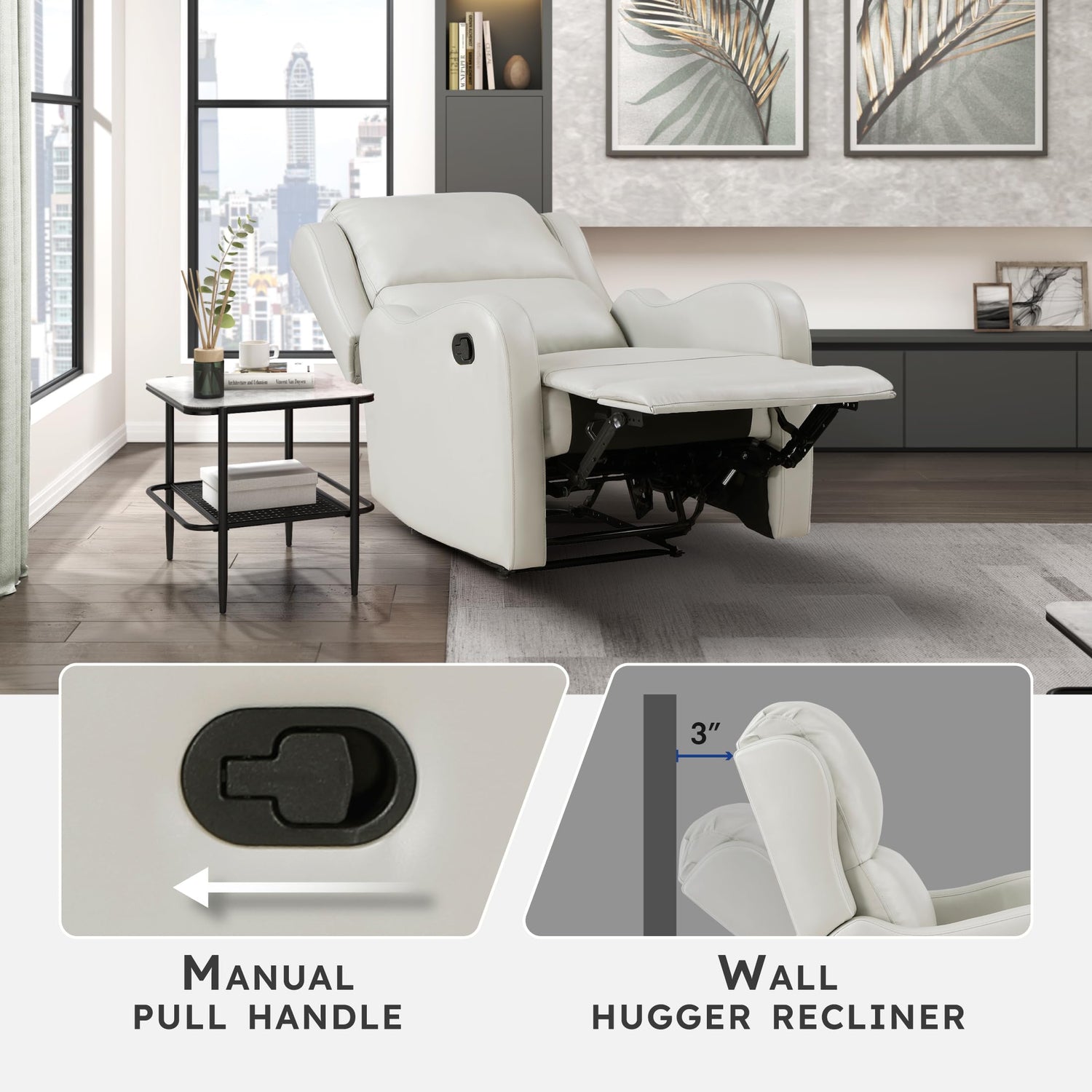 Details: Few recliners demand attention like this one. It's wrapped in high-quality faux leather upholstery that's sure to please. Every inch of the recliner is tailored to perfection, with clean, refined lines that take modern contemporary design to a new level. The single sofa chair is designed to provide an elegant and comfortable experience-the perfect arc of the handrail fits the ergonomics, making it more comfortable when you put your hand on it; retractable footrest easy to adjust the modes to meet your requirement; the deep seat of the glider recliner is nearly 22 inches providing an extremely comfortable seating experience. If you need a comfy chair for movie nights in the living room, this recliner chair has got you covered. With its seamless blend of form and function, this recliner is sure to become a favorite spot for relaxation in your home.