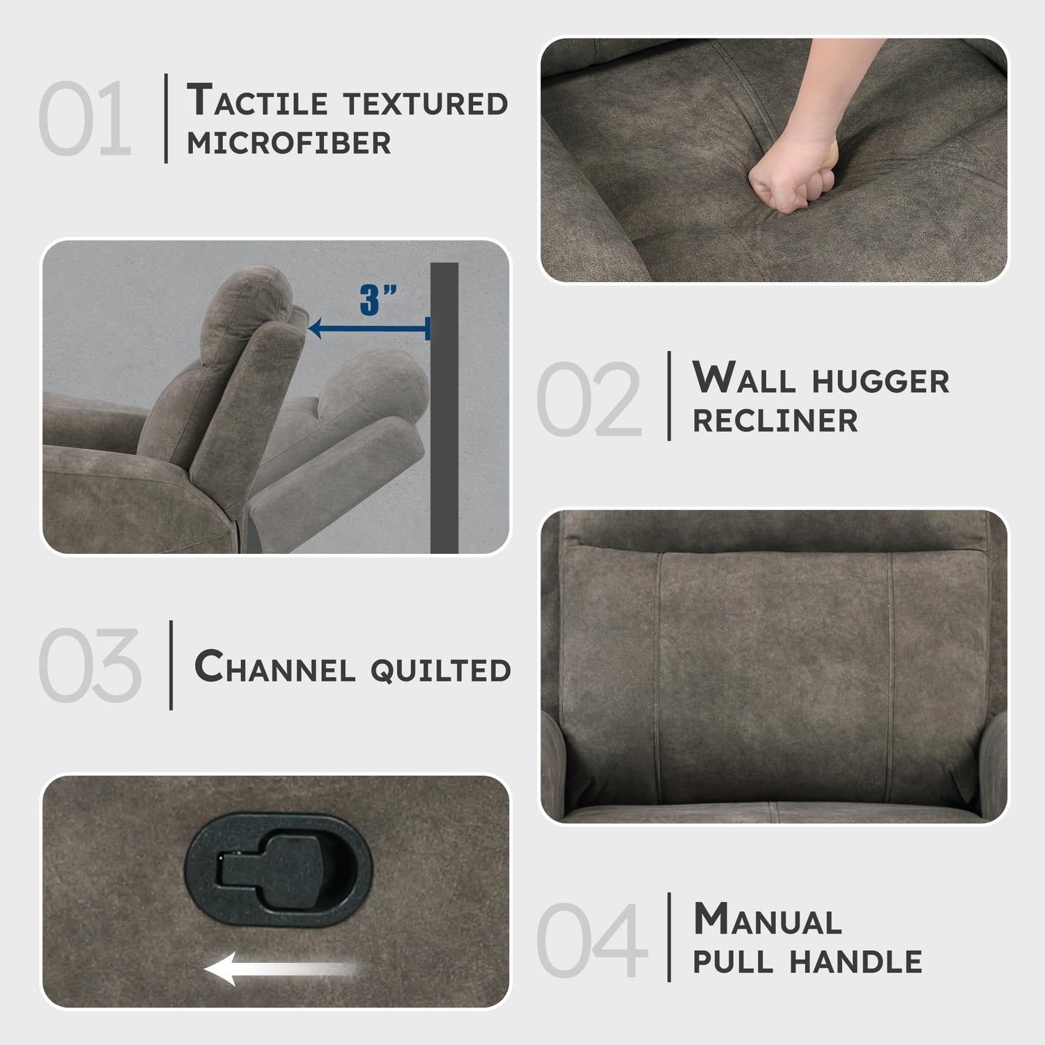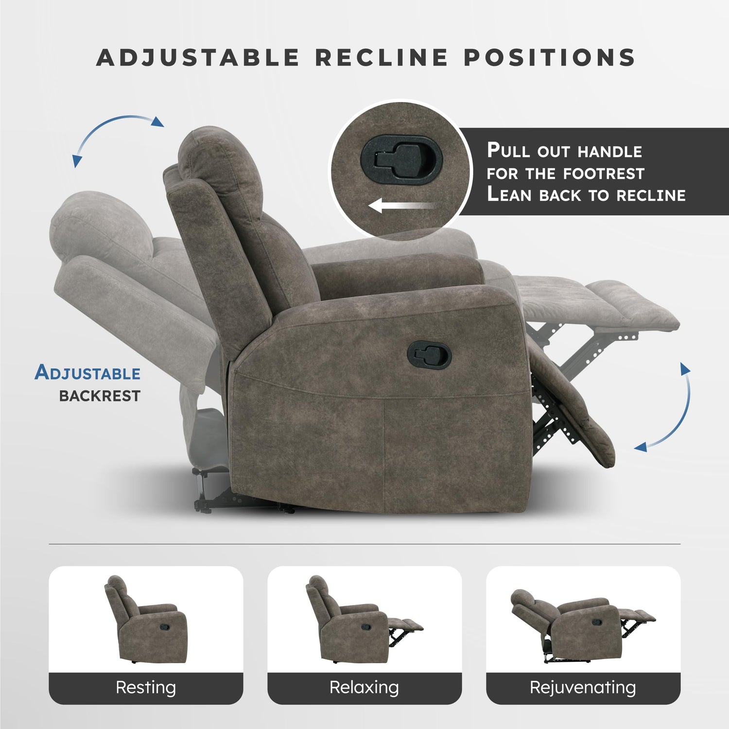 Details: Few recliners demand attention like this one. It's wrapped in textured microfiber that's sure to please. Every inch of the recliner is tailored to perfection, with clean, refined lines that take modern contemporary design to a new level. The single sofa chair is designed to provide an elegant and comfortable experience-the perfect arc of the handrail fits the ergonomics, making it more comfortable when you put your hand on it; retractable footrest easy to adjust the modes to meet your requirement; the deep seat of the recliner chairs for adults is 21.5 inches providing an extremely comfortable seating experience. Whether you're looking for a cozy spot to rock your little one to sleep in the nursery or need a comfy chair for movie nights in the living room, this nursery recliner has got you covered. With its seamless blend of form and function, this reclining accent chair is sure to become a favorite spot for relaxation in your home.