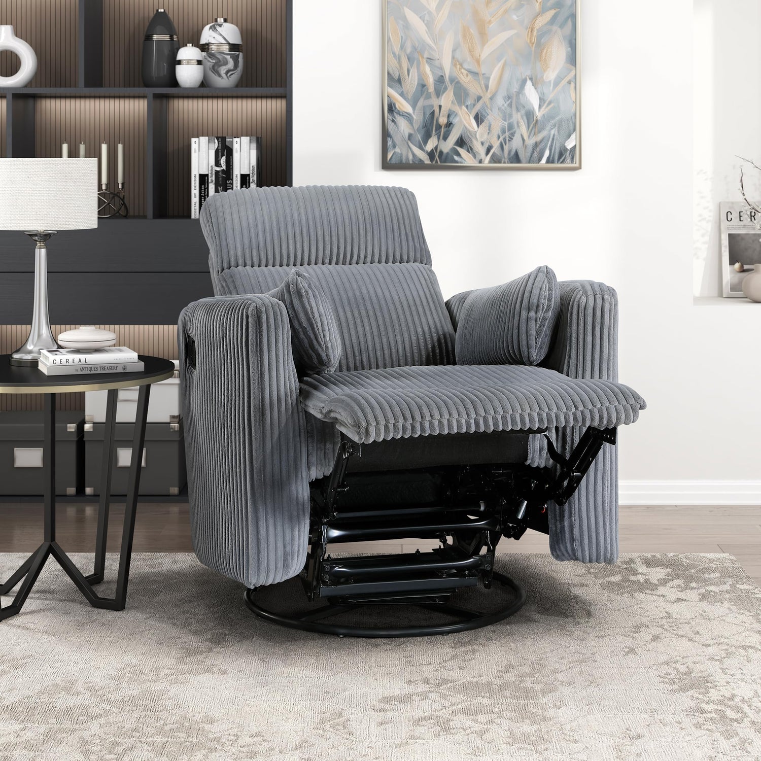 - [Contemporary & Cozy Design] This swivel recliner showcases a contemporary silhouette with luxurious corduroy upholstery in a chic solid hue. Elevated fabric channels and gently curved arms enhance its stylish and inviting appeal, making it a perfect addition to any living room, bedroom, or cozy nook