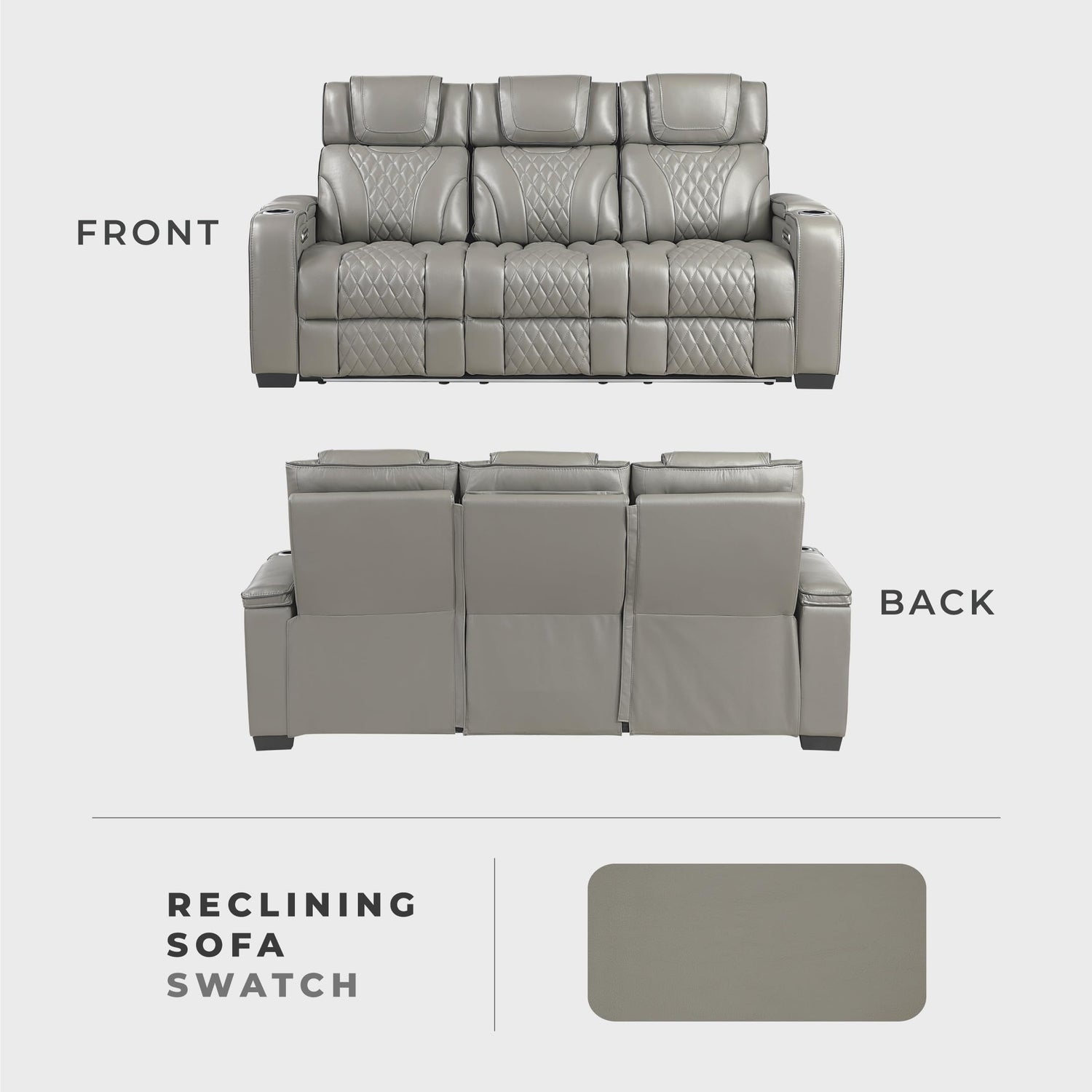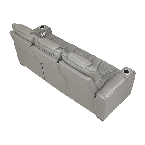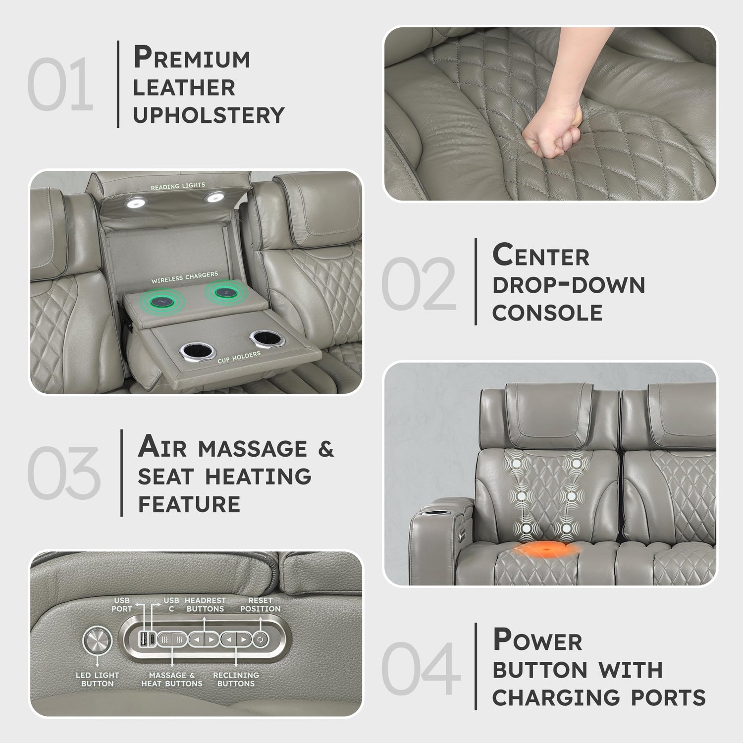 Lexicon Power Double Reclining Sofa, Center Drop-Down Table with Heat/Massage/Headrest/Storage Arms/Cup Holders/LED Lights/Wireless Charging, Top Grain Leather Match Wall Hugger Recliner Sofa, Grey