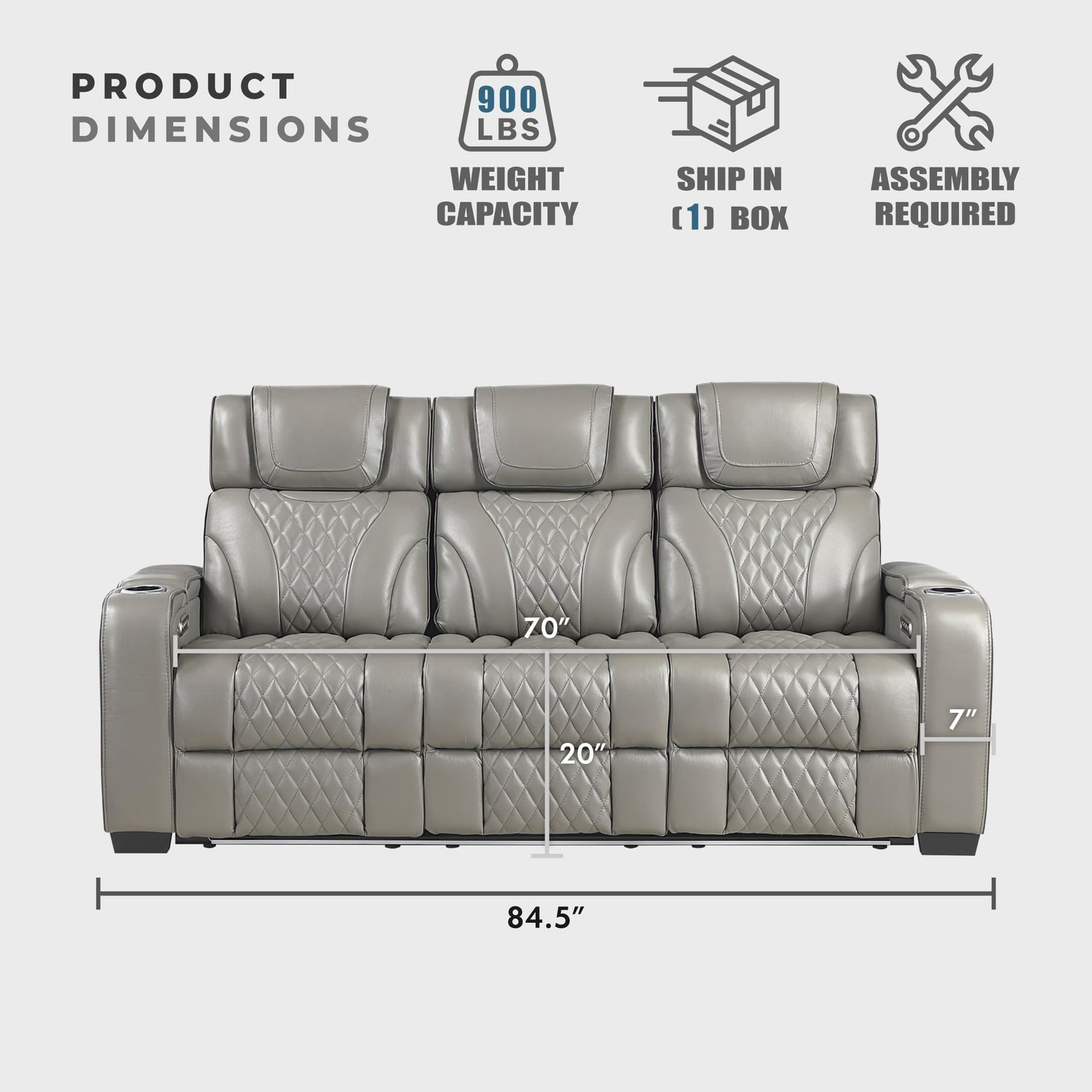 - [Generous Size] Leather power reclining sofa measures: 84.5"W x 40"D x 42.5"H; Seat measures: 70"W x 22.5"D x 20"H; Arm Height: 25"; Fully Reclined Length: 66.5"; Fully Reclined Height: 34"; Required Back Clearance to Recline: 4"; Doorway width: 25"