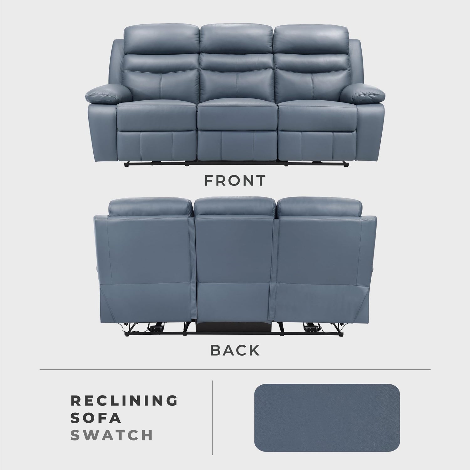 - [Top-In-Class Comfort] Relax on high-resiliency foam cushions wrapped in 100% top grain leather where the body touches and all else faux leather that's sure to please. The reclining couch features a button built into the armrest for easy control. Simply press two buttons to smoothly adjust the footrest and back to your desired reclining position. Each seat can be controlled independently, while the middle seat remains stationary.