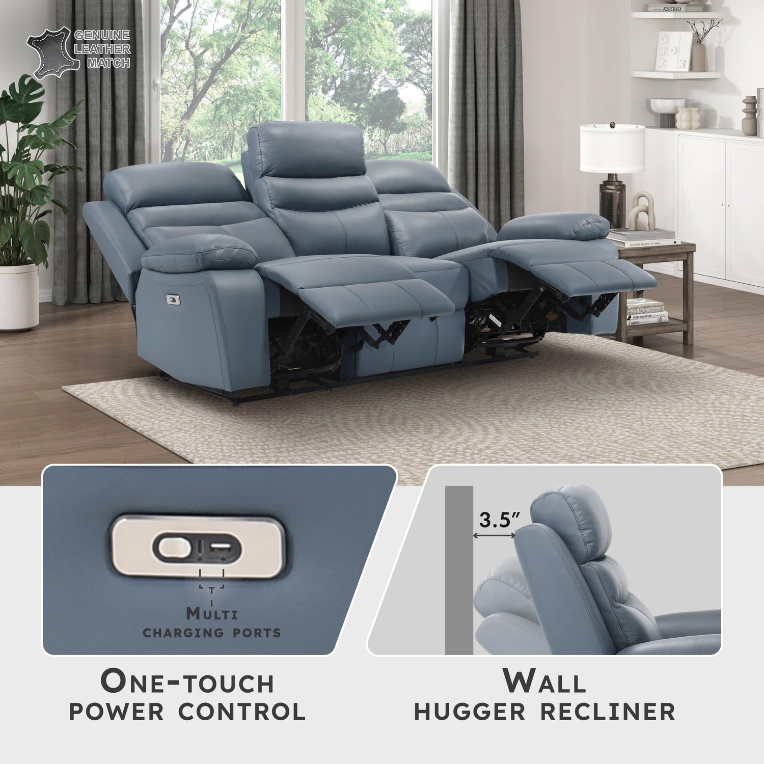 Lexicon Recliner Sofa for Living Room, Double Reclining RV Couch, Power Wall Hugger Recliner Home Theater Seating Leather Match Reclining Sofa, with USB Charge Port, 86.5''W Sofa, Blue