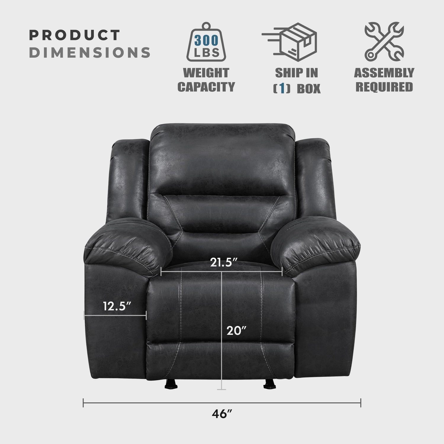 - [Generous Size & Sturdy] The recliner sofa measures: 46"W x 41.5"D x 42.5"H; reclined depth: 67.5"; back clearance: 4.5"; doorway width: 26.5". Our reclining chair is made of solid wood frame with metal reinforced seats and can hold up to 300lbs.