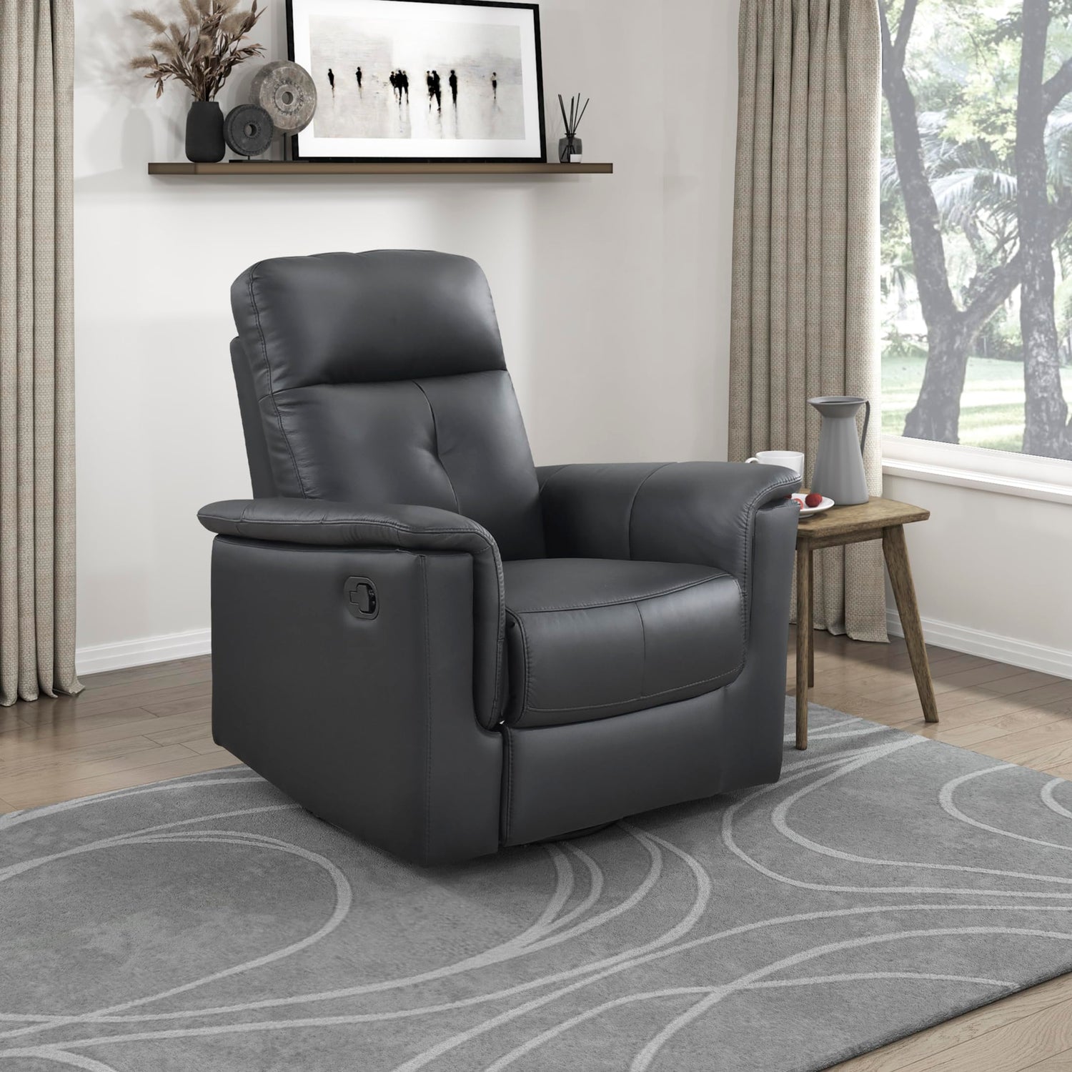 Details: Experience ultimate relaxation with the Lexicon swivel glider reclining chair. Built with a solid wood and plywood frame reinforced with metal, this chair ensures lasting durability. High-density foam padding over pocket coils provides exceptional comfort, while the luxurious 100% top-grain leather where the body touches and faux leather upholstery on other areas adds elegance and durability. The attached back and seat cushions offer a seamless look, and the convenient tab pull reclining motion allows you to adjust the chair to your preferred angle. Enjoy smooth 360-degree swivel and gentle gliding motions for added comfort and versatility. Perfect for living rooms, family rooms, or reading corners, this recliner is designed to offer both style and functionality.