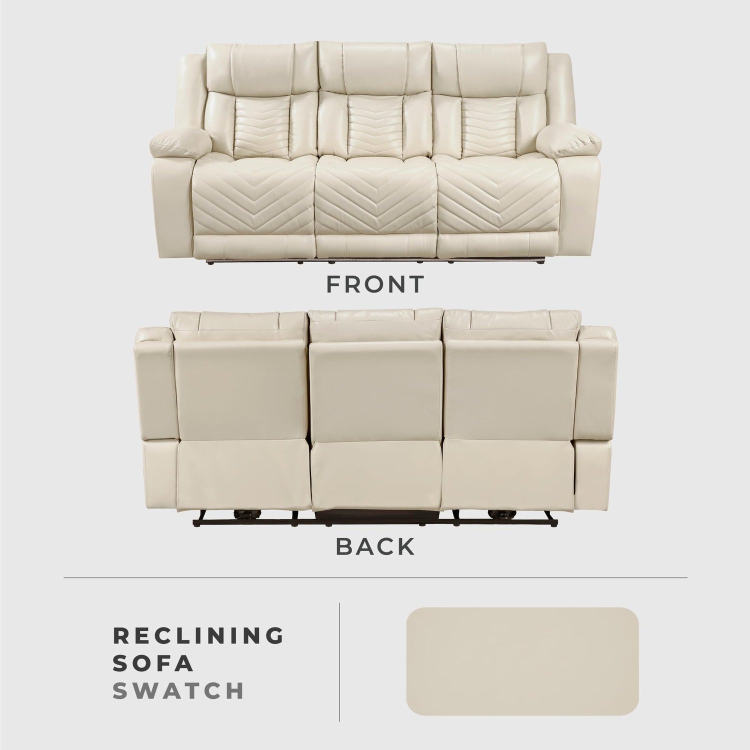 Details: Prepare to be enveloped in an oasis of modern comfort with this extraordinary reclining sofa. Beneath the supple, premium faux leather, adorned with striking V-pattern stitching, lies a foundation of robust solid wood and a metal-reinforced seat, promising lasting durability. Sink into the plush embrace of foam padding over pocket coils, each movement powered by a whisper-quiet, one-touch control, allowing you to effortlessly find your perfect repose. But this is more than just a sofa; it's an entertainment hub. A drop-down center table unveils dual cup holders, a convenient magazine pocket, and a seamless wireless charger, ensuring everything you need is at your fingertips. Stay connected with integrated USB charging ports, and as evening descends, bask in the ambient glow of the captivating underneath LED lighting, transforming your living room into a cinematic sanctuary. This sofa isn't just a piece of furniture; it's an experience.