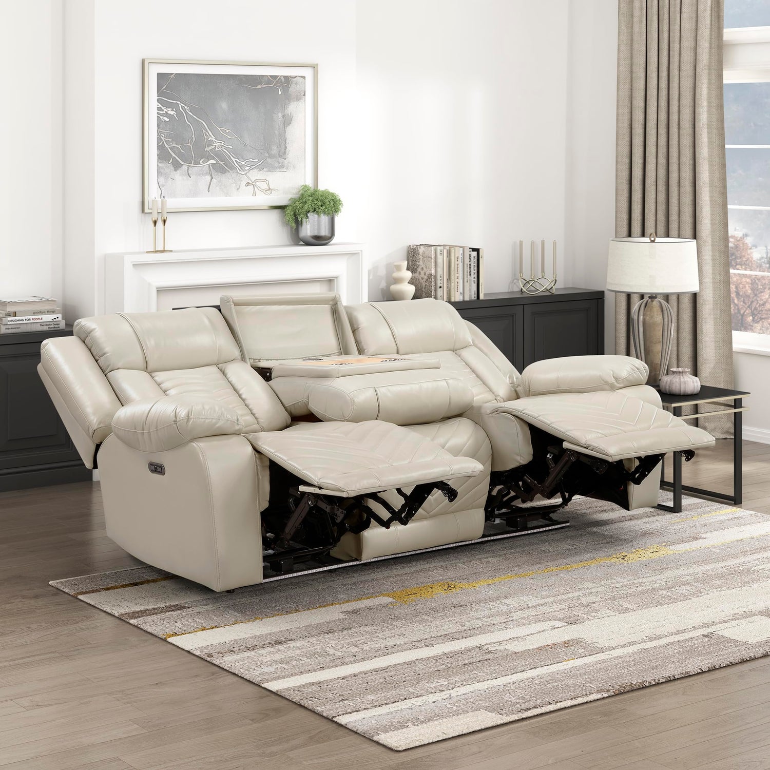 Lexicon Wall Hugger Power Double Reclining Sofa with Center Drop-Down Table, Faux Leather Home Theater Seating with LED Lighting/USB Charging Ports/Wireless Charger/Cup Holders, Magazine Pocket, Beige