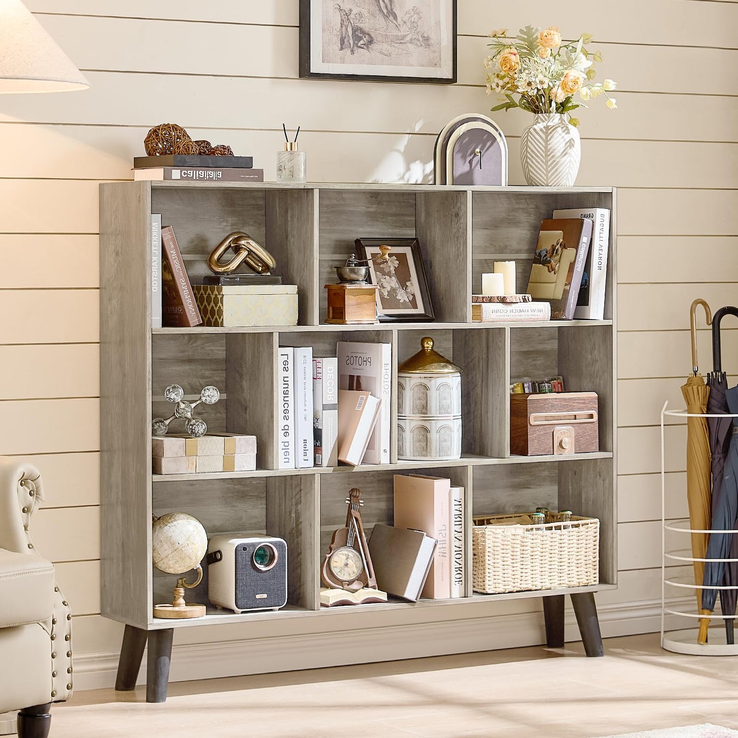 LEYAOYAO 10 Cube Bookshelf,3 Tier Modern Wide Bookcase with Legs,Mid-Century Wood Bookshelves Storage,Retro Grey Large Book Case,Freestanding Organizer Display Shelf for Bedroom,Living Room,Office
