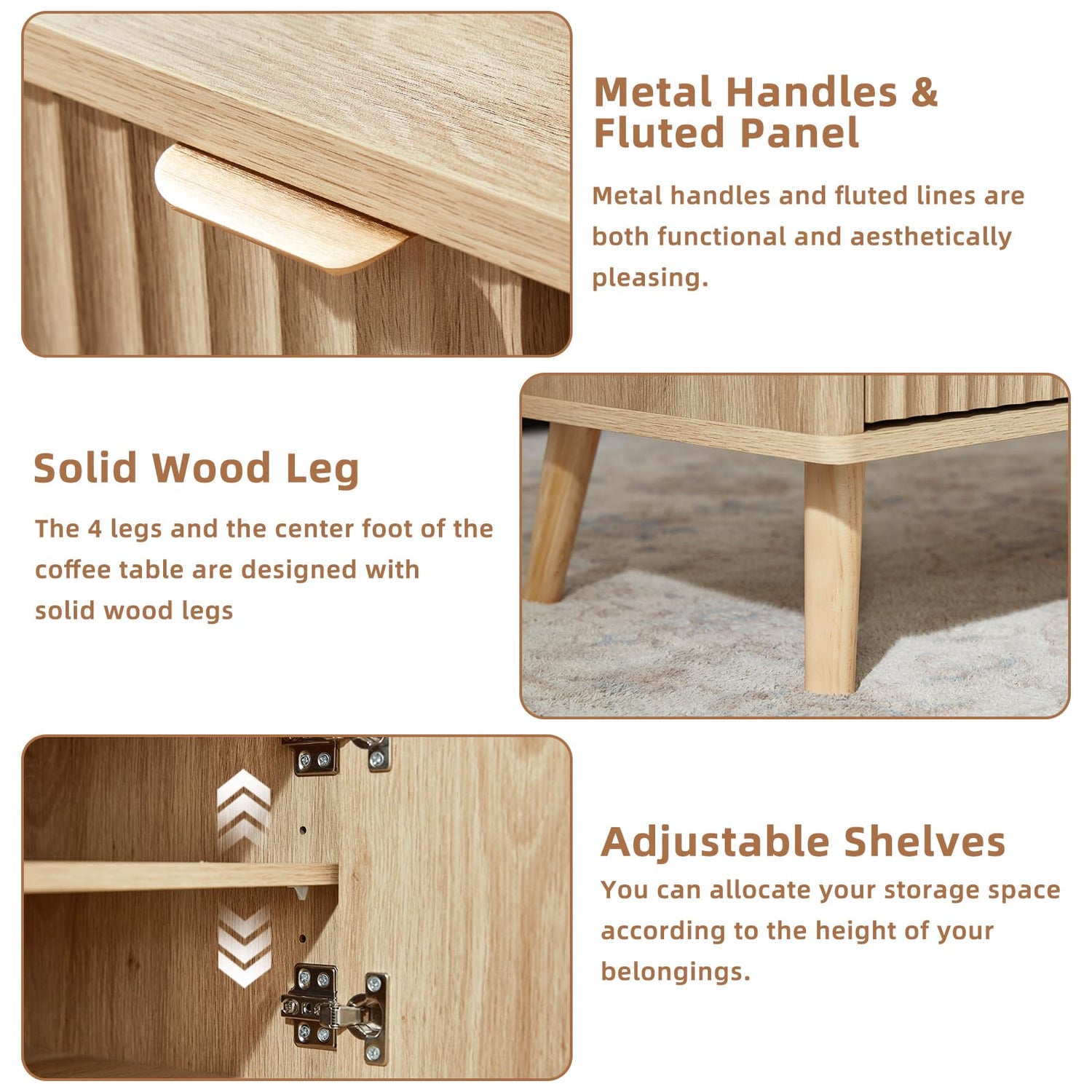 - [Premium Fluted Coffee Table] Crafted from distressed wood and vintage metal knobs, this wooden coffee table brings pure farmhouse charm to any space. Fluted wavy doors fronts and metal knobs create a warm focal point, while the natural woodgrain finish complements modern, rustic, or shabby-chic décor styles.