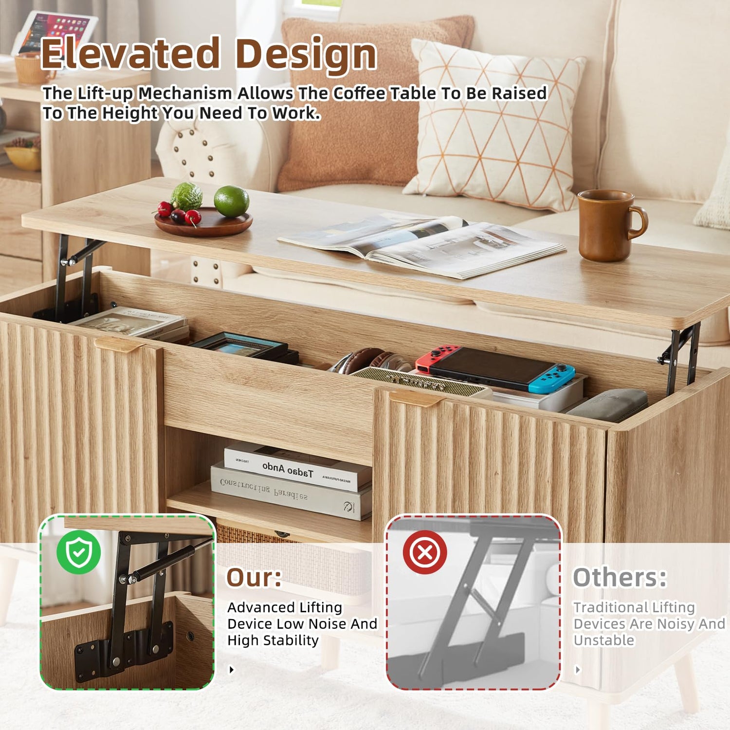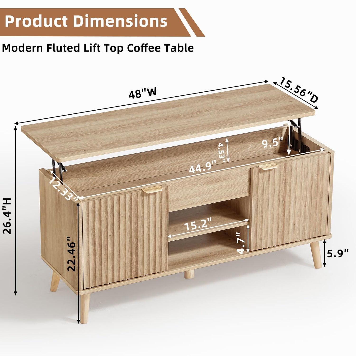LEYAOYAO 48" Fluted Lift Top Coffee Table with Hidden Storage & Adjustable Shelves, Lifting Tabletop Large Rectangular Coffee Tables, Mid Century Modern Wood Center Table for Living Room, Natural