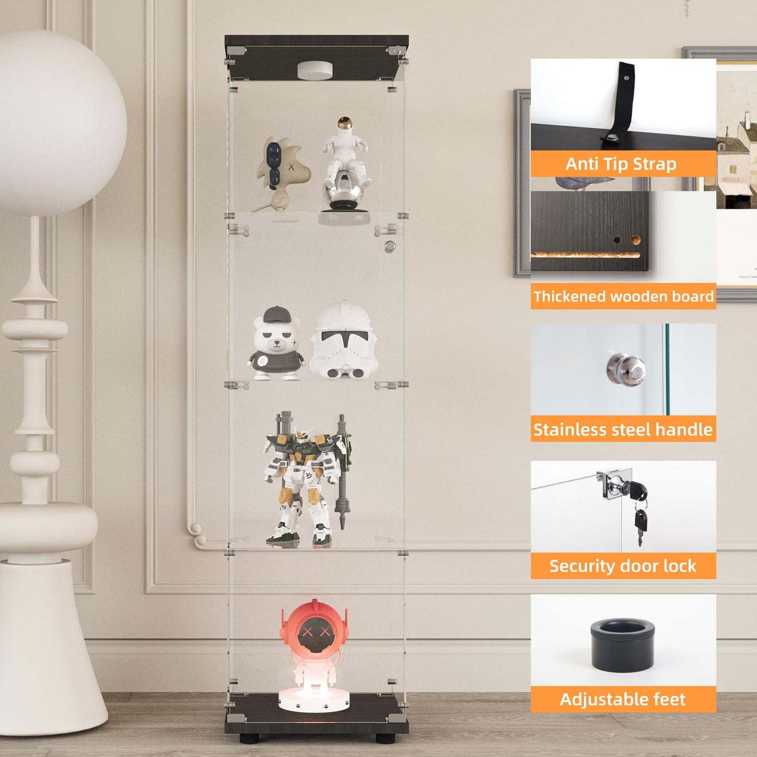 - Wide Use: Curio cabinets with glass doors provide sufficient capacity to display action figures, wine, toys, art, etc. It can be used as a display cabinet in the living room, a wine cabinet in the kitchen, a bookshelf in the study, or a hand-made display rack in the collection room. We recommend securely fixing the glass cabinet onto the wall to ensure the safety of you and your family