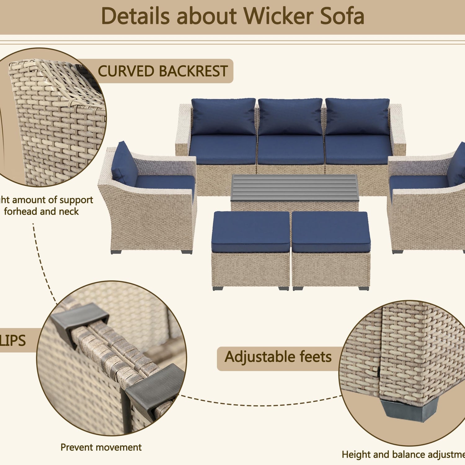 LHBcraft Outdoor Patio Furniture Set 8 Pieces, Rattan Outdoor Couch with Coffee Table, Comfortable Wicker Patio Furniture Sets for Yard, Pool or Porch, Blue