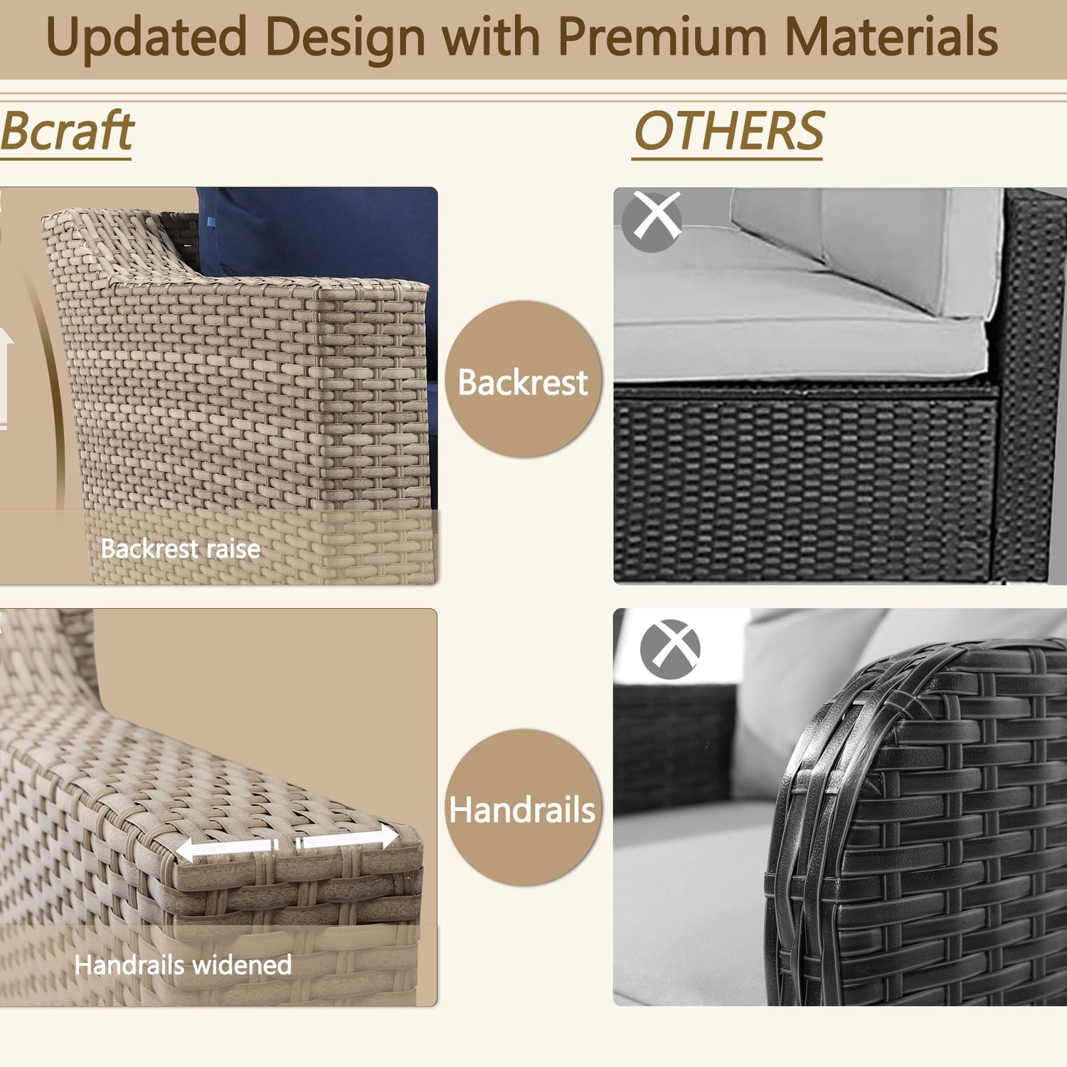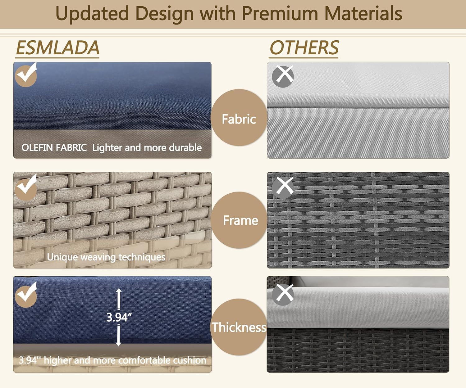 - 💯【FASHIONABLE NEW DESIGN】This latest outdoor patio conversation set is crafted with high-quality PE rattan weaving and thickened material that is water and UV resistant. The furniture is reinforced with a rust-resistant steel frame.