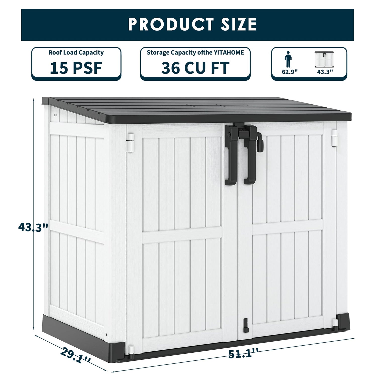 - EXTRA LARGE STORAGE CAPACITY - Externally, this storage shed measures 50 inches long * 28.5 inches wide * 44 inches high, with a capacity of 34 cubic feet; perfect for storing gardening tools, small lawn mowers, bicycles, garden furniture and 2 small bins. You can add another laminate shelf (48x13 inches, sold separately), if you want to reduce clutter and save space, placing a storage shed in your yard, garden, backyard, living room or pool is a good choice.