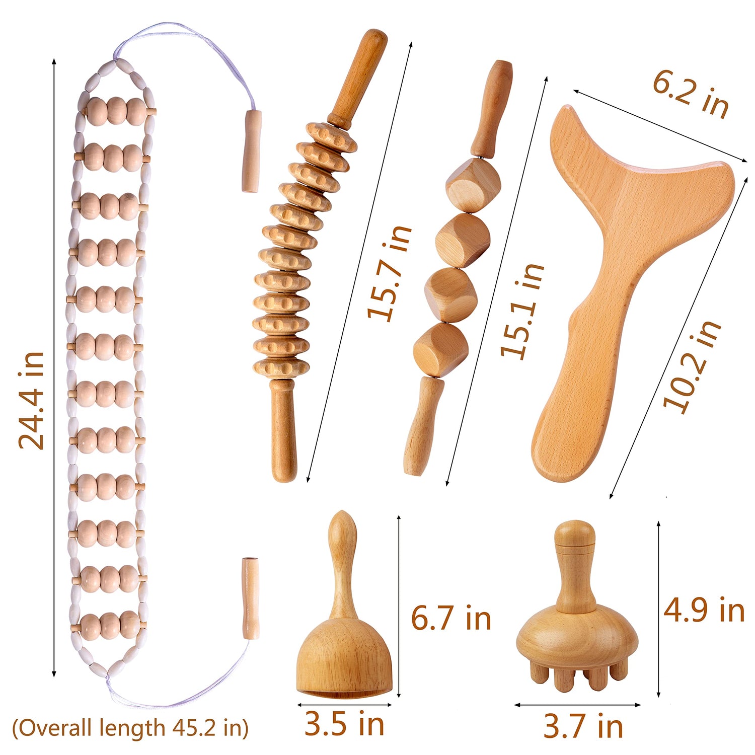 - 【6-in-1 Massage Set】: We've put together the 6 most effective cellulite wood therapy tools in one set. You will get 1*wood gua sha massage Board, 1*wood Swedish cup, 1*4-Cube Roller Stick massager, 1* 12-wheel curved roller stick massager, 1*wood back massage roller rope tool , 1*wood mushroom massager.