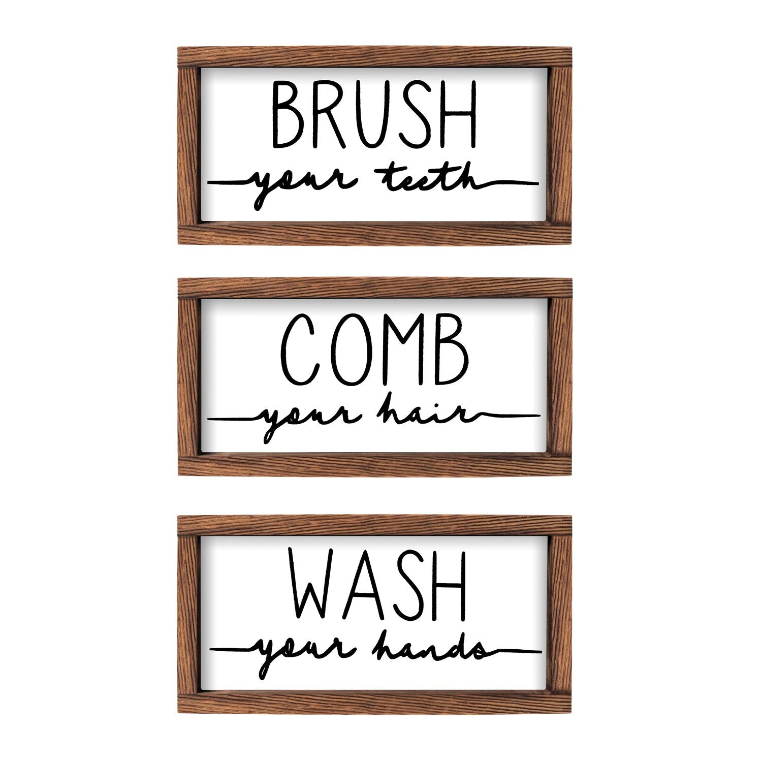 - SET OF 3 BATHROOM SIGN: One set includes 3 popular bathroom sayings plaque, each one says: "Wash Your Hands" "Brush Your Teeth" “Comb Your Hair”. hanging to display the bathroom sign together or scattered about for a fantastic look.
