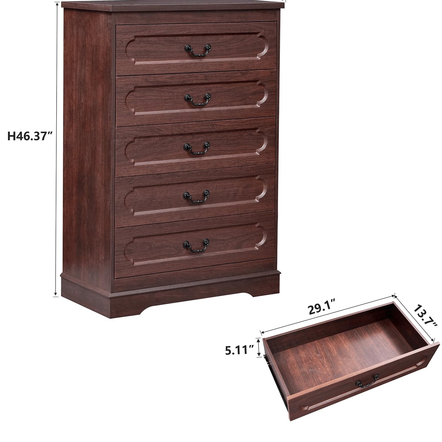 - 5 Drawers Bedroom Dresser- Dimensions: 46.37"(H) x 31.5"(W) x 15.7"(D). Tall dressers for bedroom features 5 spacious wooden large drawers (Size: 29.1''W x 13.7''D x 5.11''H) which provides ample storage space for your bedroom, kidsroom, guest room, closet, hallway or living room, keeping your clothes and essentials organized and easily accessible