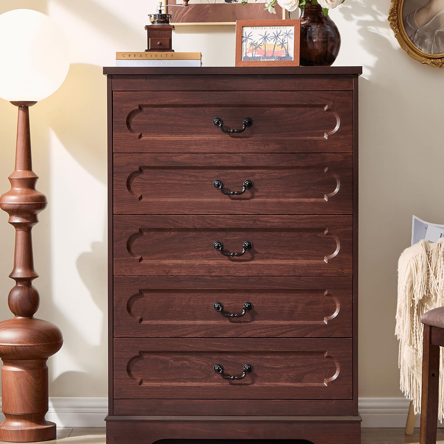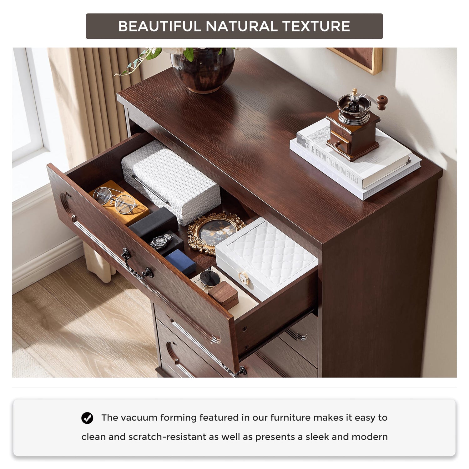 - Drawer Dresser with Spacious Tabletop -A spacious surface designed to elegantly showcase your decorative accents, cherished photo frames, or vibrant greenery — all while maintaining a cosy environment through intelligent vertical organization