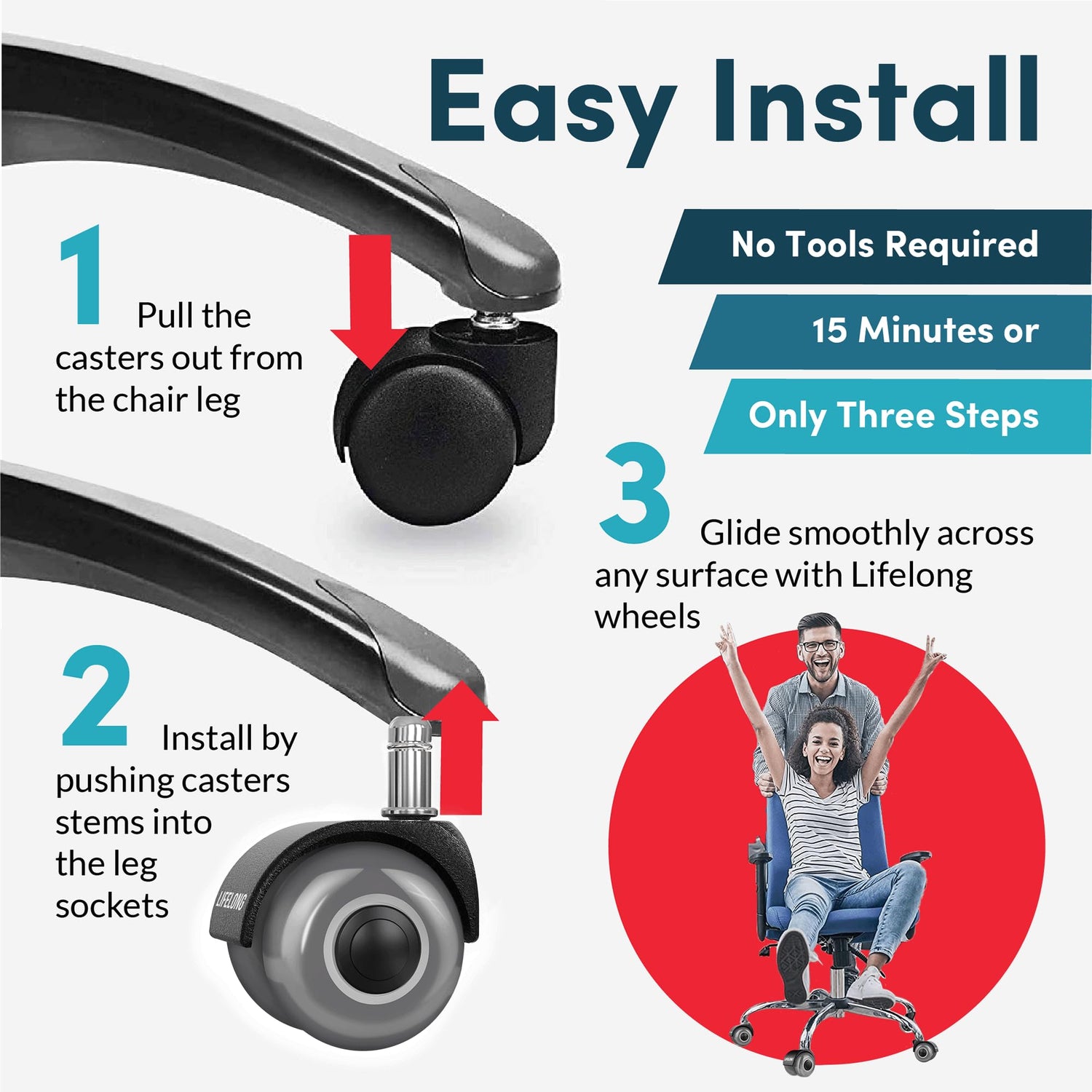 Lifelong Office Chair Wheels Replacement Rubber Desk Chair Casters for Hardwood Floors and Carpet, Set of 5, Heavy Duty Casters for Chairs to Replace Office Chair Mats - Fits 98%