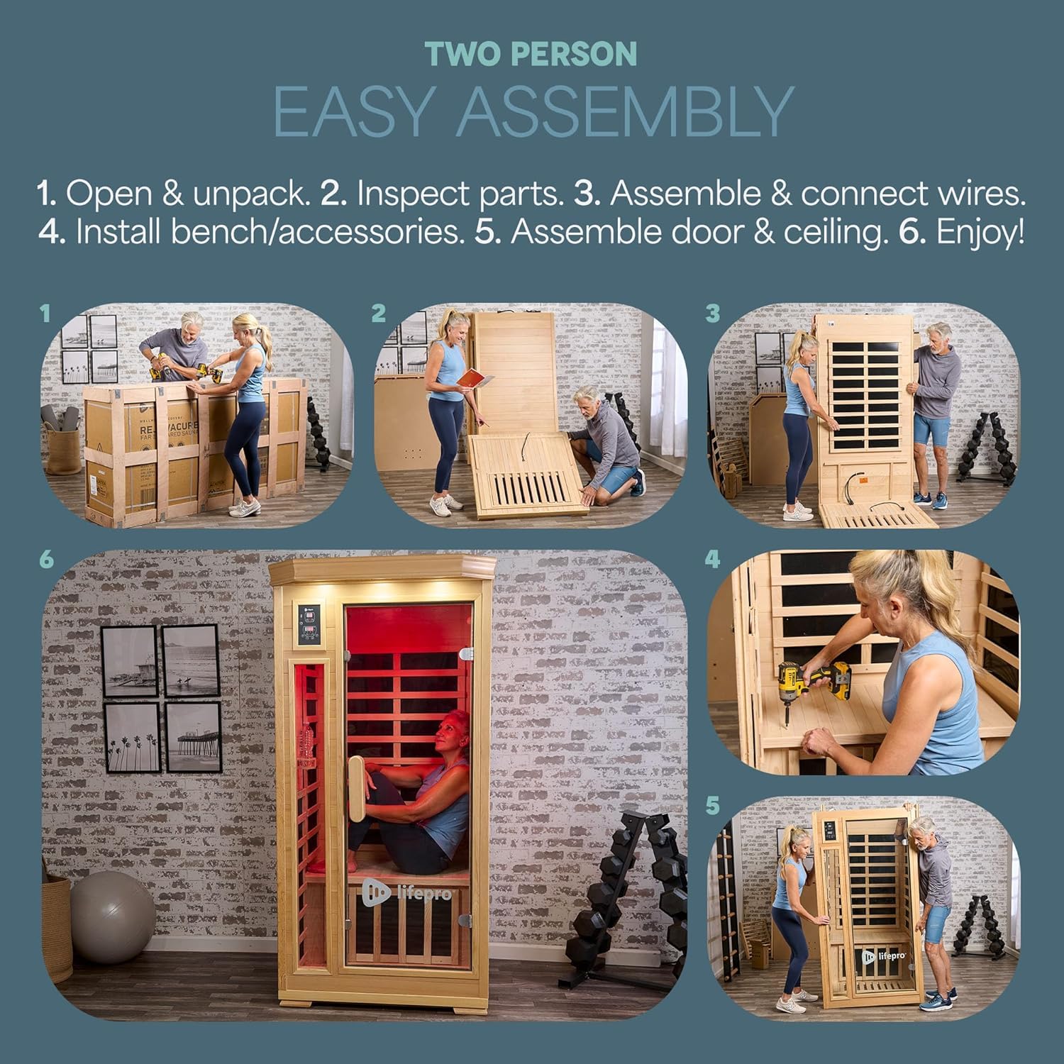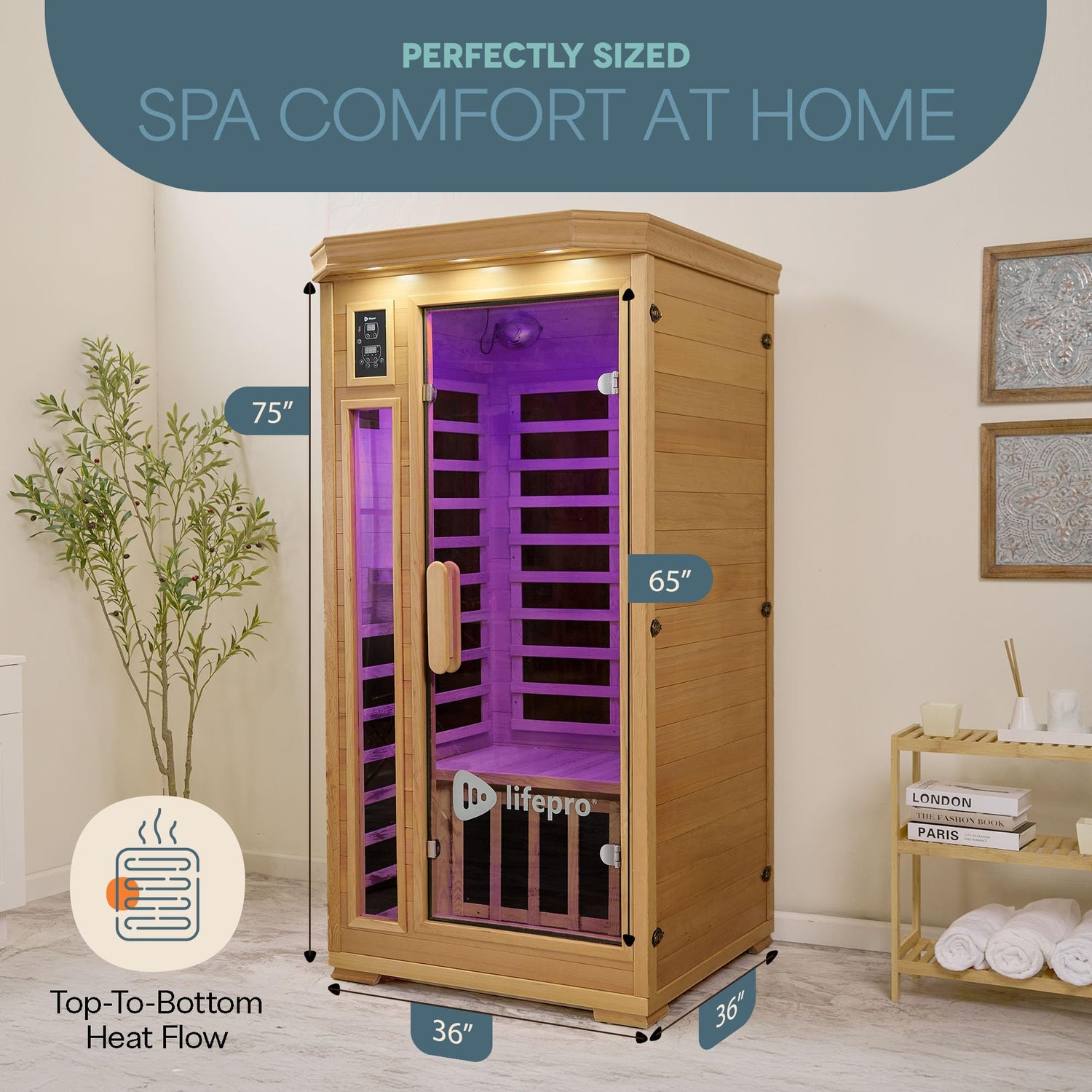 - HOME SAUNA INFRARED: Enjoy the Lifepro RejuvaCure Wood Sauna's benefits at home. Detoxify, reduce stress, and improve skin health with carbon fiber heaters. This compact dry sauna (35.4” L × 35.4” W × 74.8” H) fits easily in any space and is crafted with your health in mind — we use non-toxic, water-based adhesives to assemble the panels, ensuring low odor and chemical safety for sensitive users.