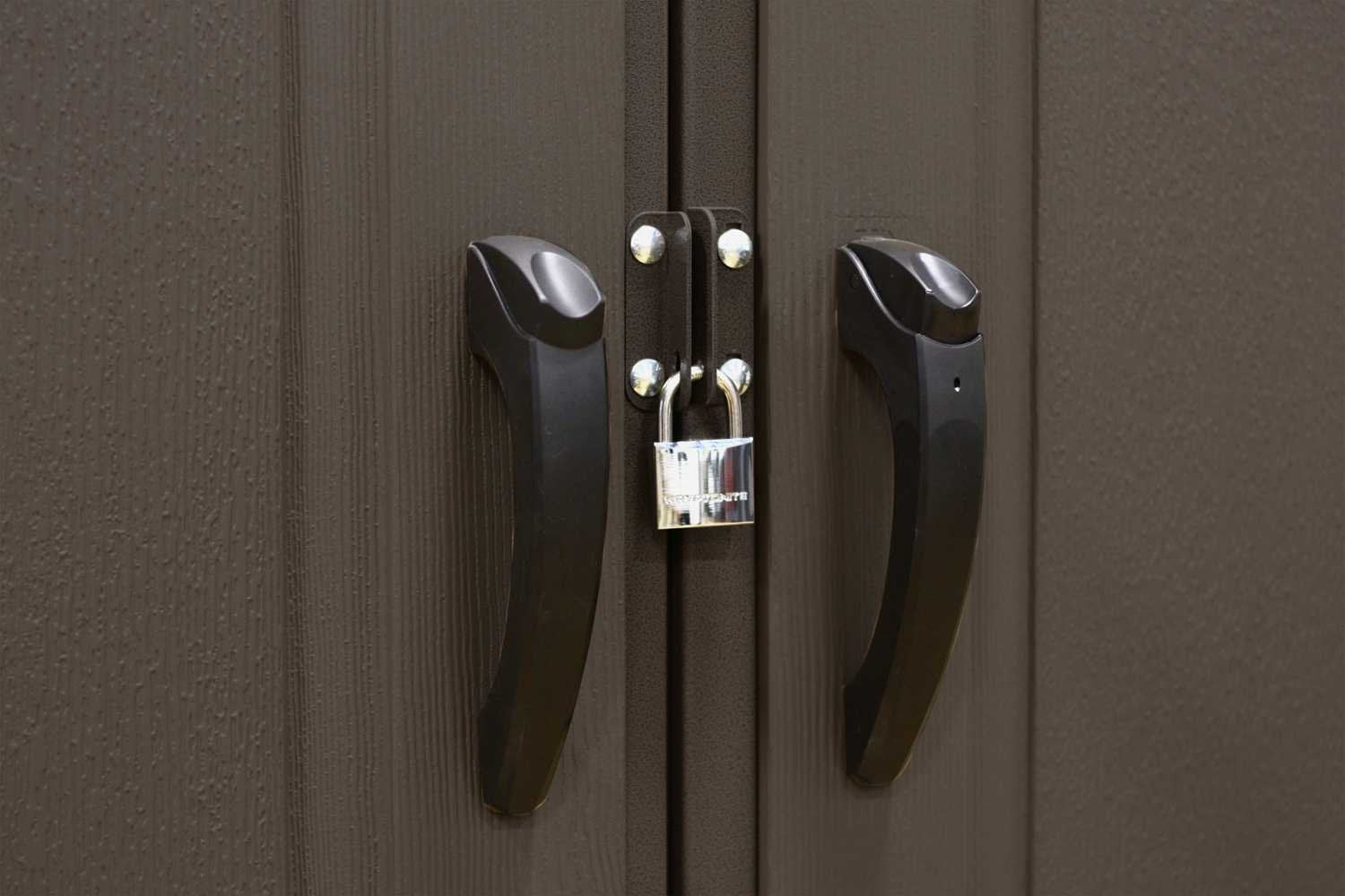 Details: This sturdy high-density polyethylene storage shed comes in an attractive design, featuring 2 double-door entryways and a slant-styled roof. Inside is plenty of storage features for garden tools and outdoor supplies, including peg strips and 4 corner shelves. The 10' x 8' space allows ample room for heavier items such as lawnmowers, while the exterior provides protection from rain, snow and UV damage. Product Features: Sturdy steel-reinforced construction Attractive appearance fit for your backyard or garden Dual-wall high-density polyethylene construction Heavy-duty steel trusses provide additional roof strength UV protected to prevent weather damage High-pitched roof allows for quick drainage of rain and snow Lockable steel-reinforced doors for added security Slip-resistant high-density polyethylene floor protects against oil, solvents and stains Skylights allow natural light to illuminate interior Customizable shelving and storage system 3 windows made from shatter-proof polycarbonate View Assembly Instructions Warranty: 10 years (Model 60001)