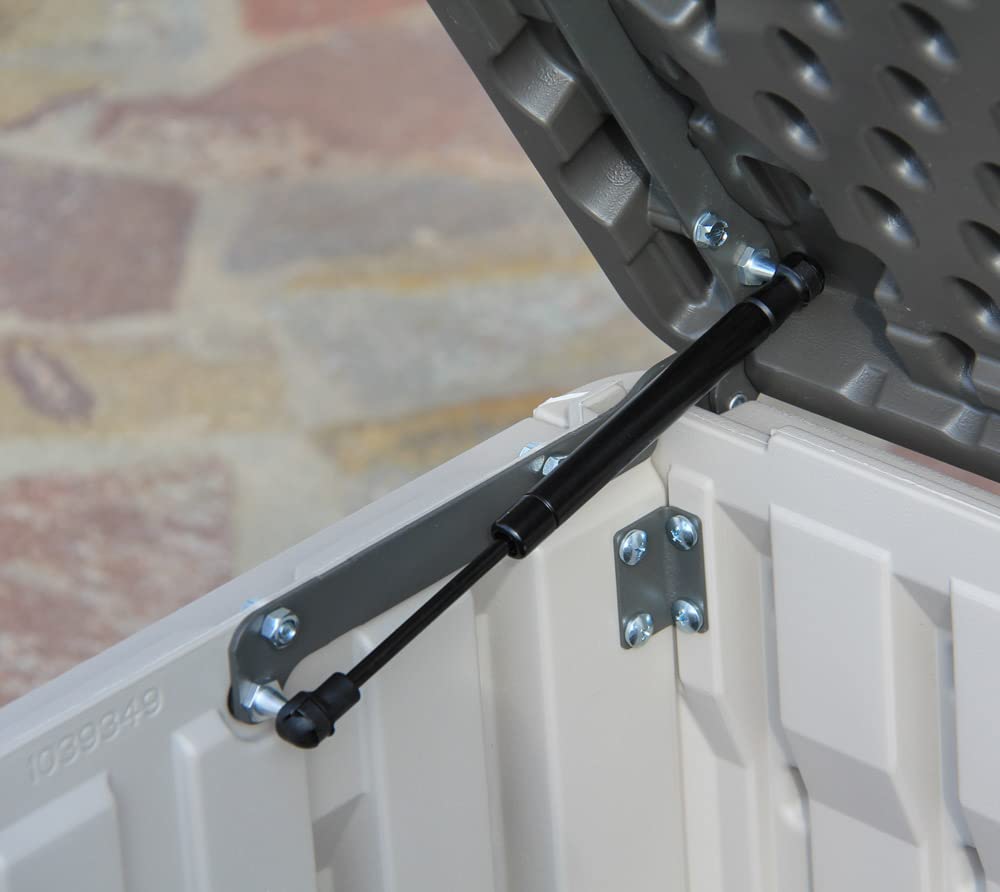 - Extra-large deck box made from high-density polyethylene (HDPE) plastic, powder-coated steel hinges