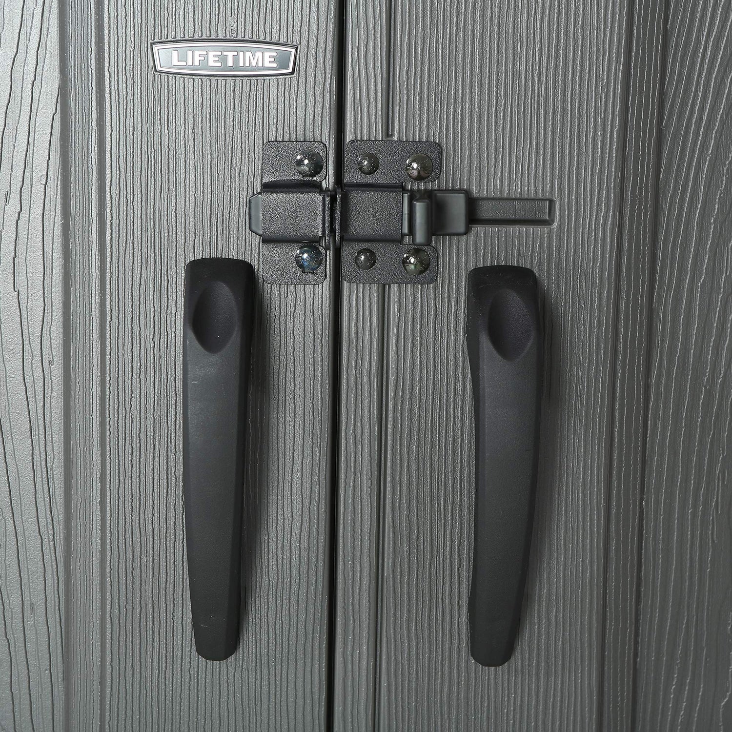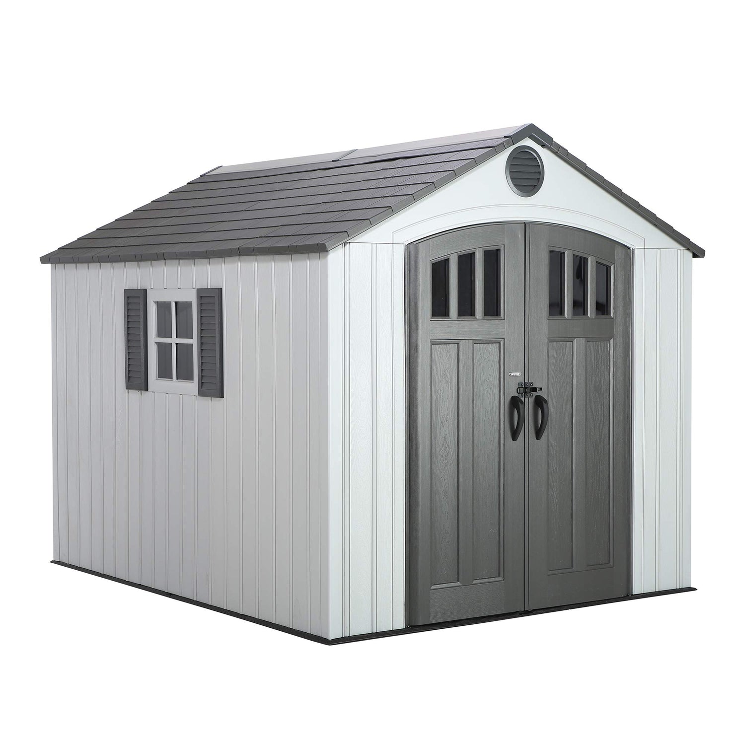 Details: Lifetime 8-Foot wide outdoor storage sheds are the perfect solution to your storage needs. Built with durable, dual-wall high-density polyethylene, our sheds are steel-reinforced & low-maintenance. With a wide range of features including shatter proof windows, skylights, custom shelving, & much more, A Lifetime shed is the perfect addition to your backyard. Features: vertical siding, slider latch, window shutters, 3-pane doors, (1) Ridge Skylight, (1) shatter-proof window, (2) screened vents, (1) 90 in. X 9 in. Shelf, (4) decorative corner trims, (6) wall hooks, & a 10-year limited . Comes in Gray with a wood-grain Floor, installation hardware included, & comes in (2) boxes. DIMENSIONS: Door Opening Dimensions 56 in. W x 75 in. H (142, 2 cm x 190, 5 cm) Nominal Dimensions 8 ft. x 10 ft. (2, 43 m x 3, 04 m) Exterior Roof Dimensions 8 ft. W x 10 ft. D (2, 43 m x 3, 04 m) Interior Dimensions 7 ft. 6 in. W x 9 ft. 6 in. D x 5 ft. 10 in. - 7 ft. 10 in. H (2, 28 m x 2, 89 m x 1, 17 - 2, 38 m)Exterior Dimensions 7 ft. 8 in. W x 9 ft. 8 in. D x 8 ft. H (2, 33 m x 2, 94 m x 2, 43 m) Footprint 7 ft. 10 in. W x 9 ft. 10 in. D (2, 38 m x 2, 99 m)
