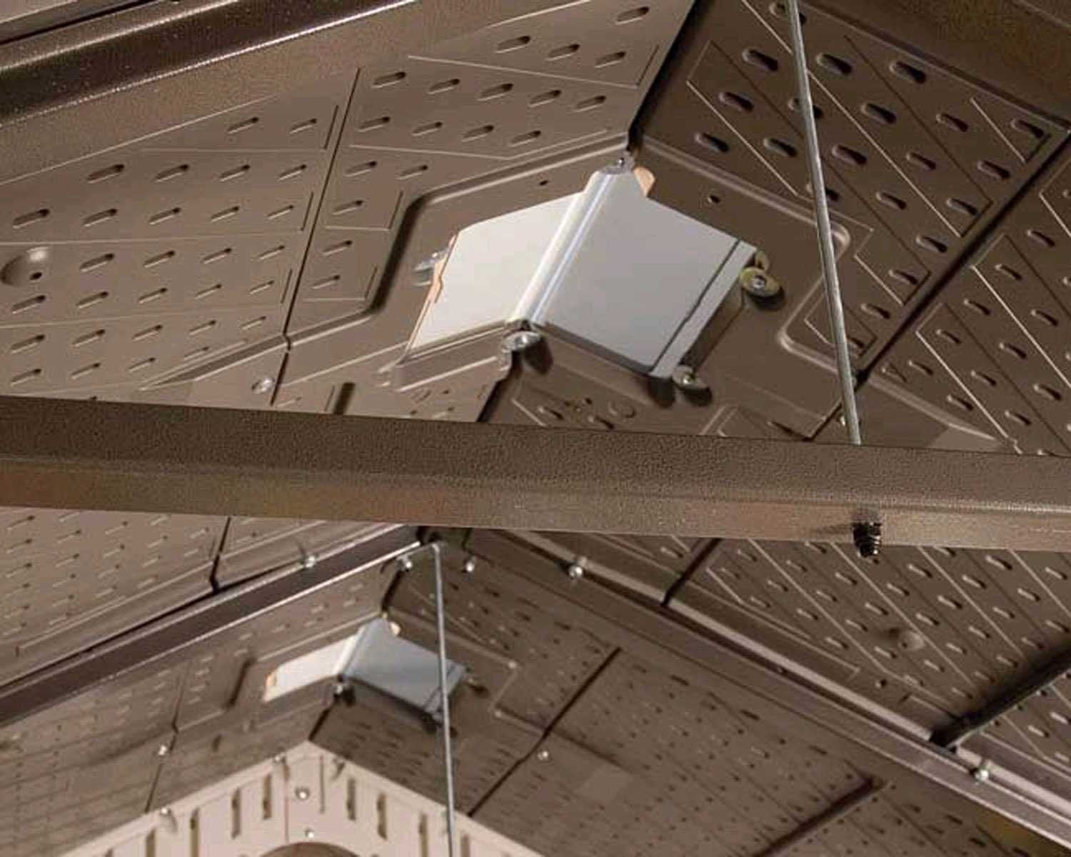 Details: 8 x 5 Storage Shed is made in the U.S.A. Constructed with powder coated steel A-frame roof trusses and internal wall structure of steel-reinforced double polyethylene panels. High grade metal screws ensure secure-fastened assembly. Peak screen vent cap offers airflow and ventilation. Low maintenance features include UV-Protection to help prevent fading and cracking, weather resistant seams help keep interior dry, stain resistant finish is easy to clean and never needs painting. Your yard is a jungle - its time to tame it with this year-round storage unit.